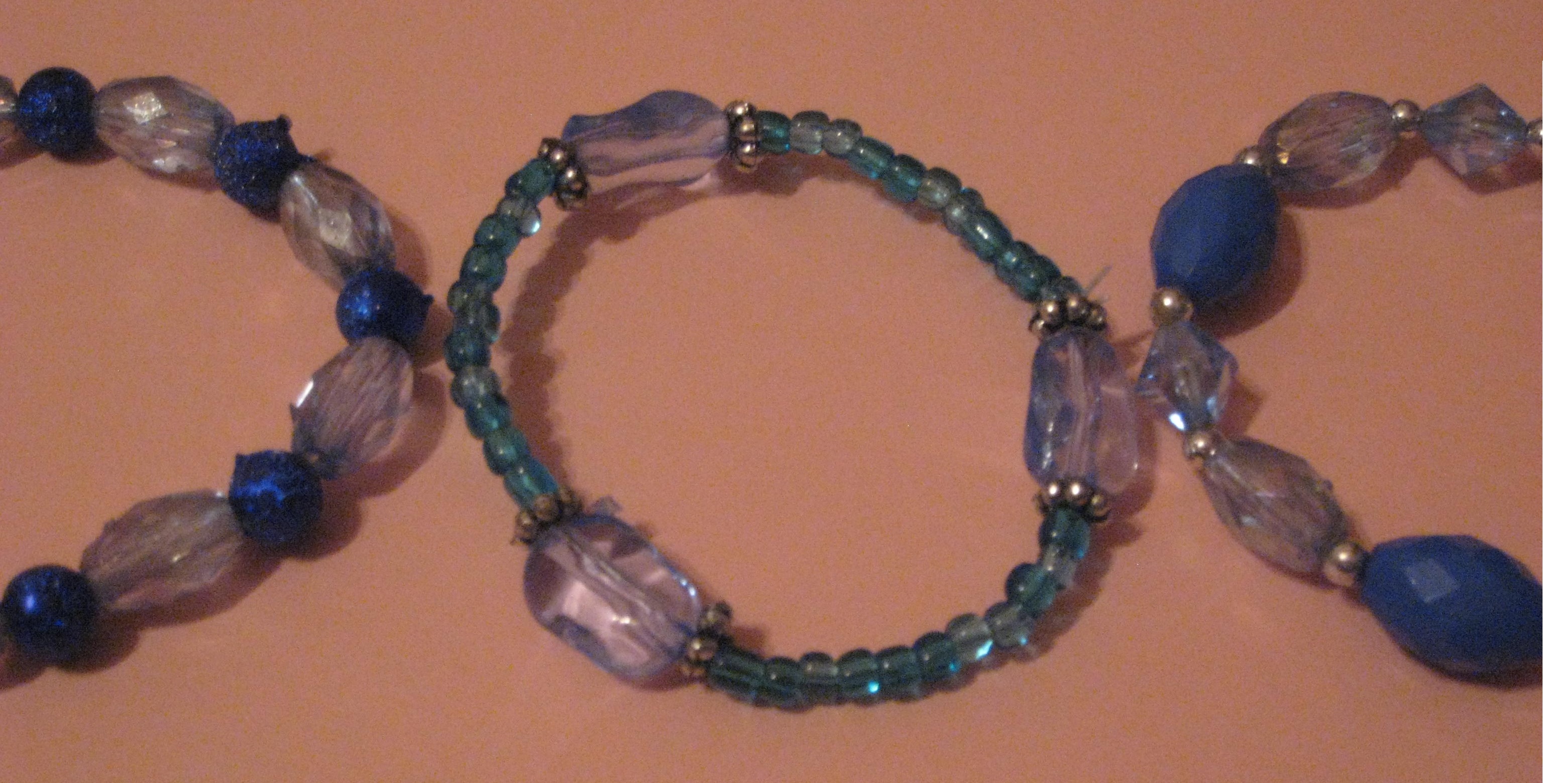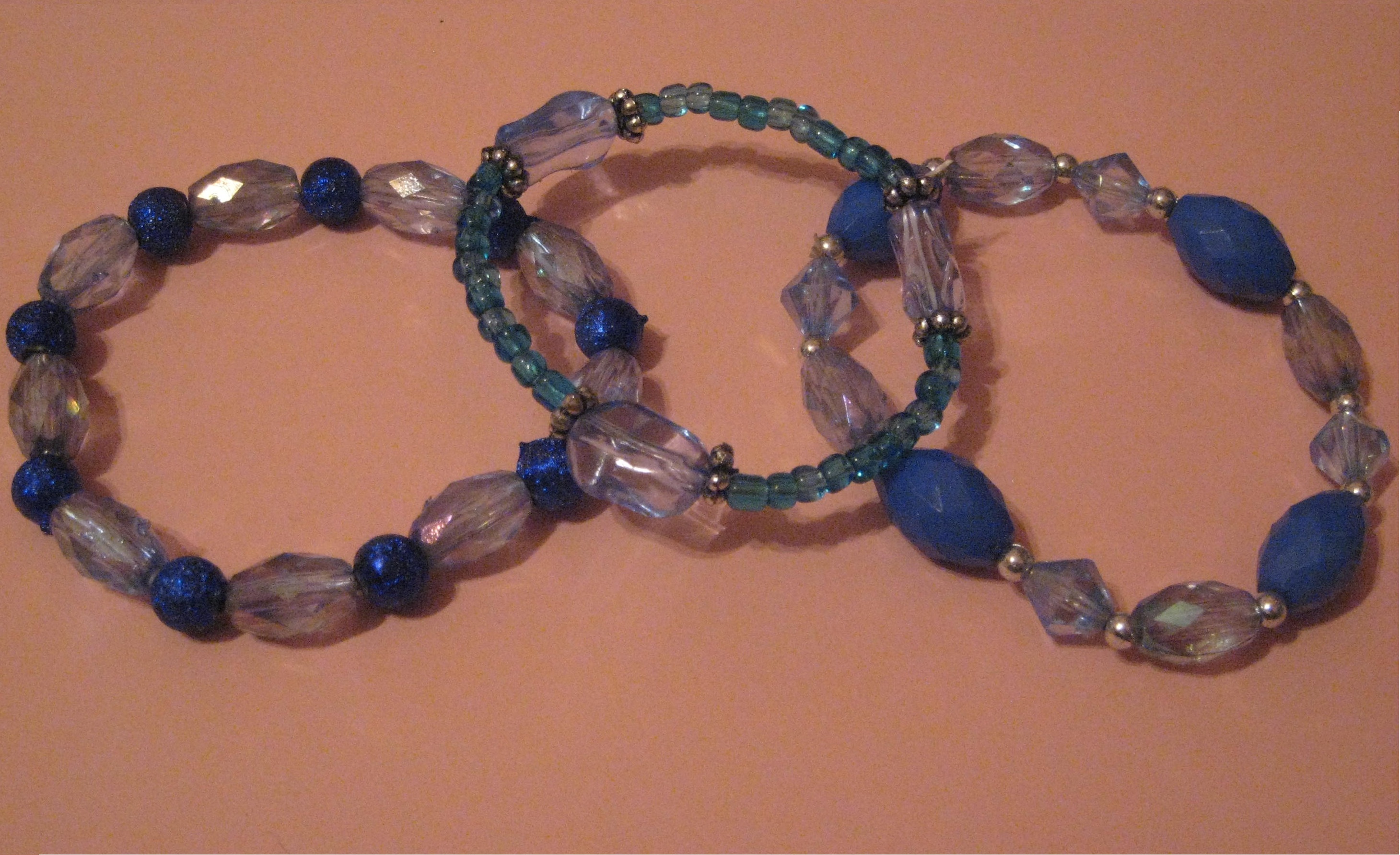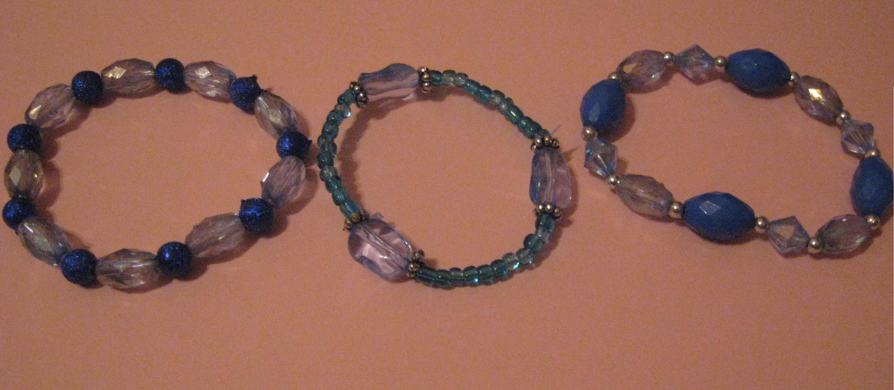 Lightweight and durable stretch bracelets highlighted with stylish beads in various shades of blues & teals with silver accent beads. Includes the 3 bracelets shown.