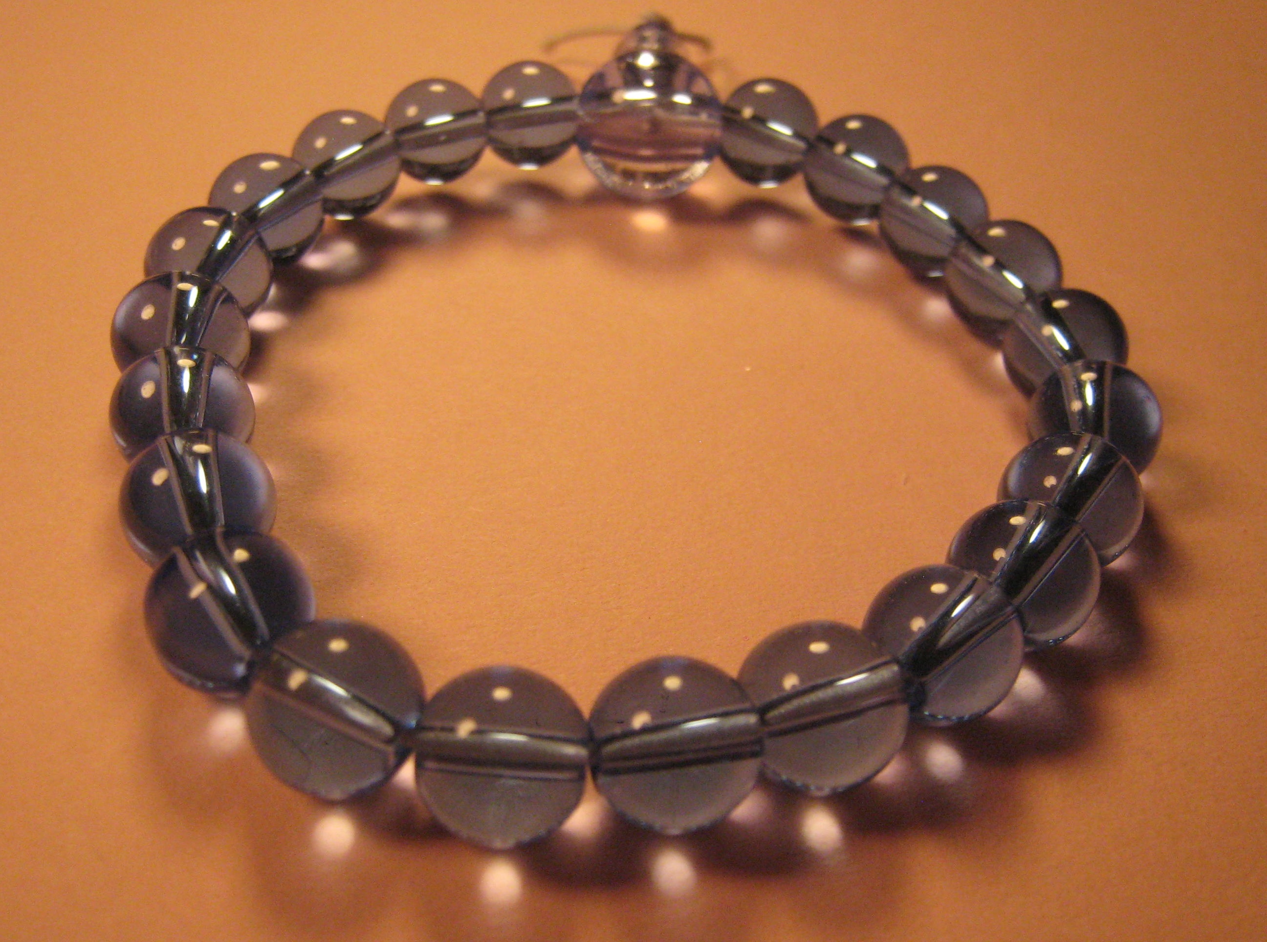 Stylish and chic 8mm round light blue color coated glass beads on stretchy cording.