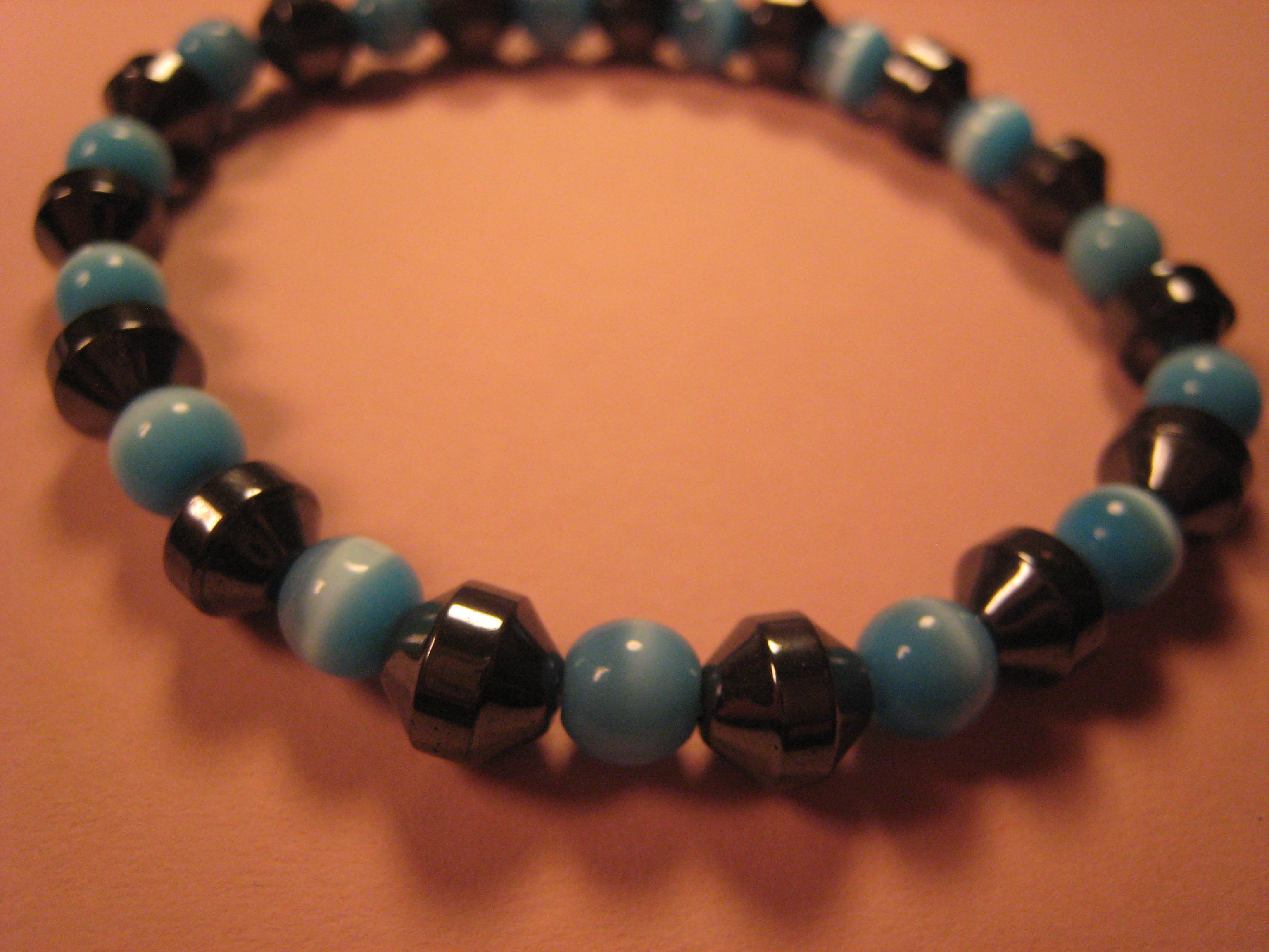 5-7mm round teal cat's eye glass and Hemalyke bicone beads make up this 7-inch stretch bracelet which will fit six- to eight-inch wrists.