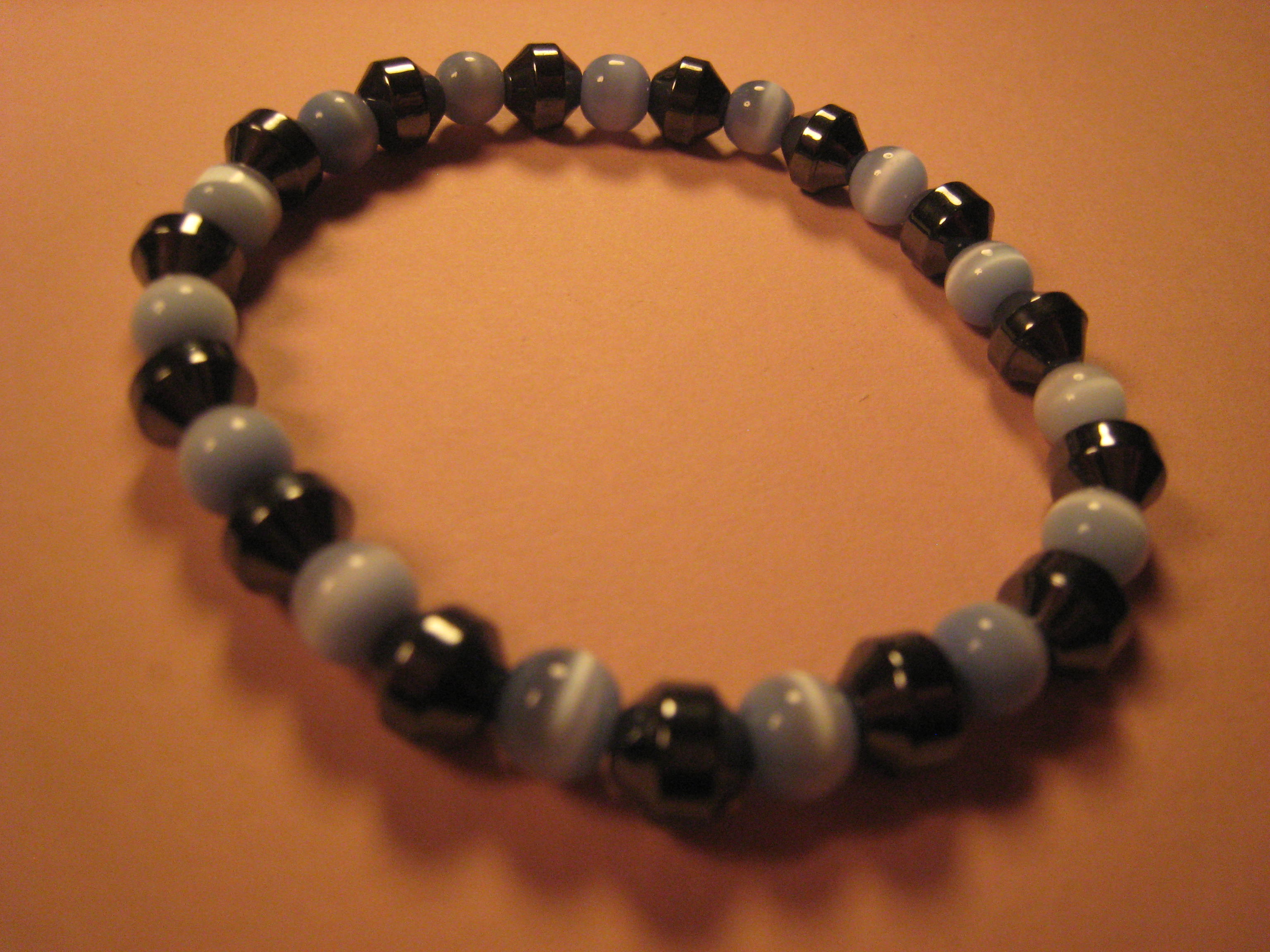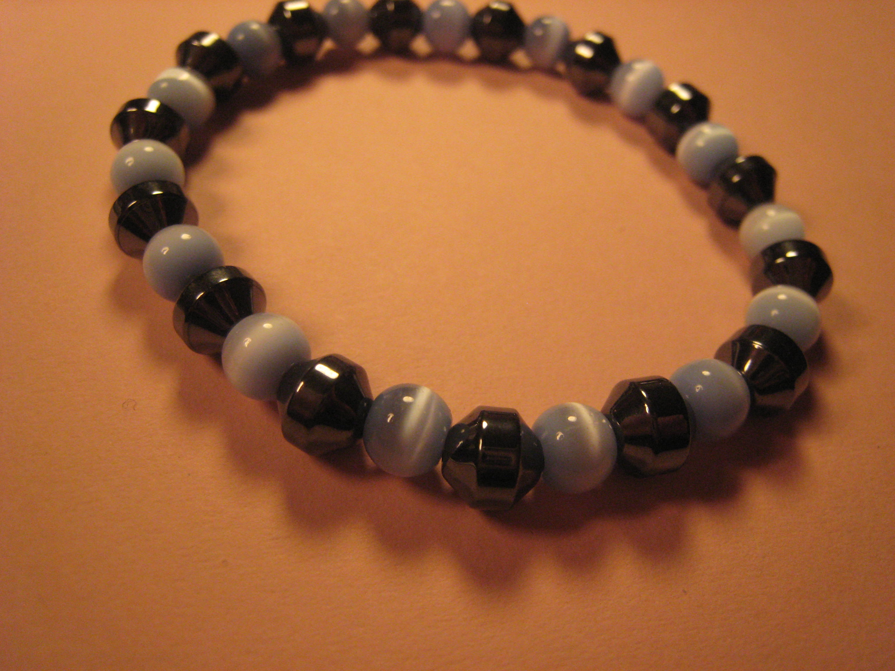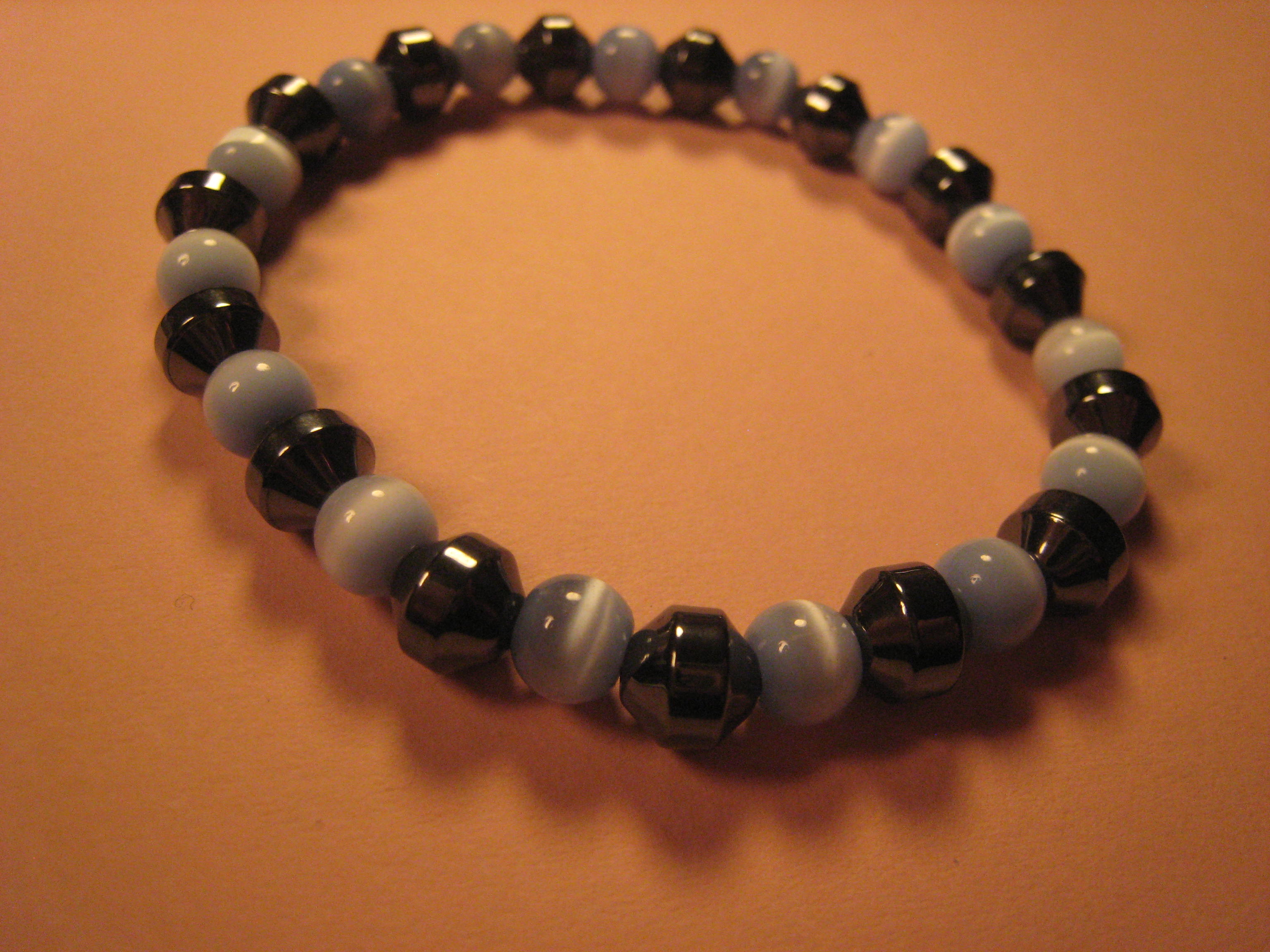 5-7mm round light blue cat's eye glass and Hemalyke bicone beads make up this 7-inch stretch bracelet which will fit six- to eight-inch wrists.