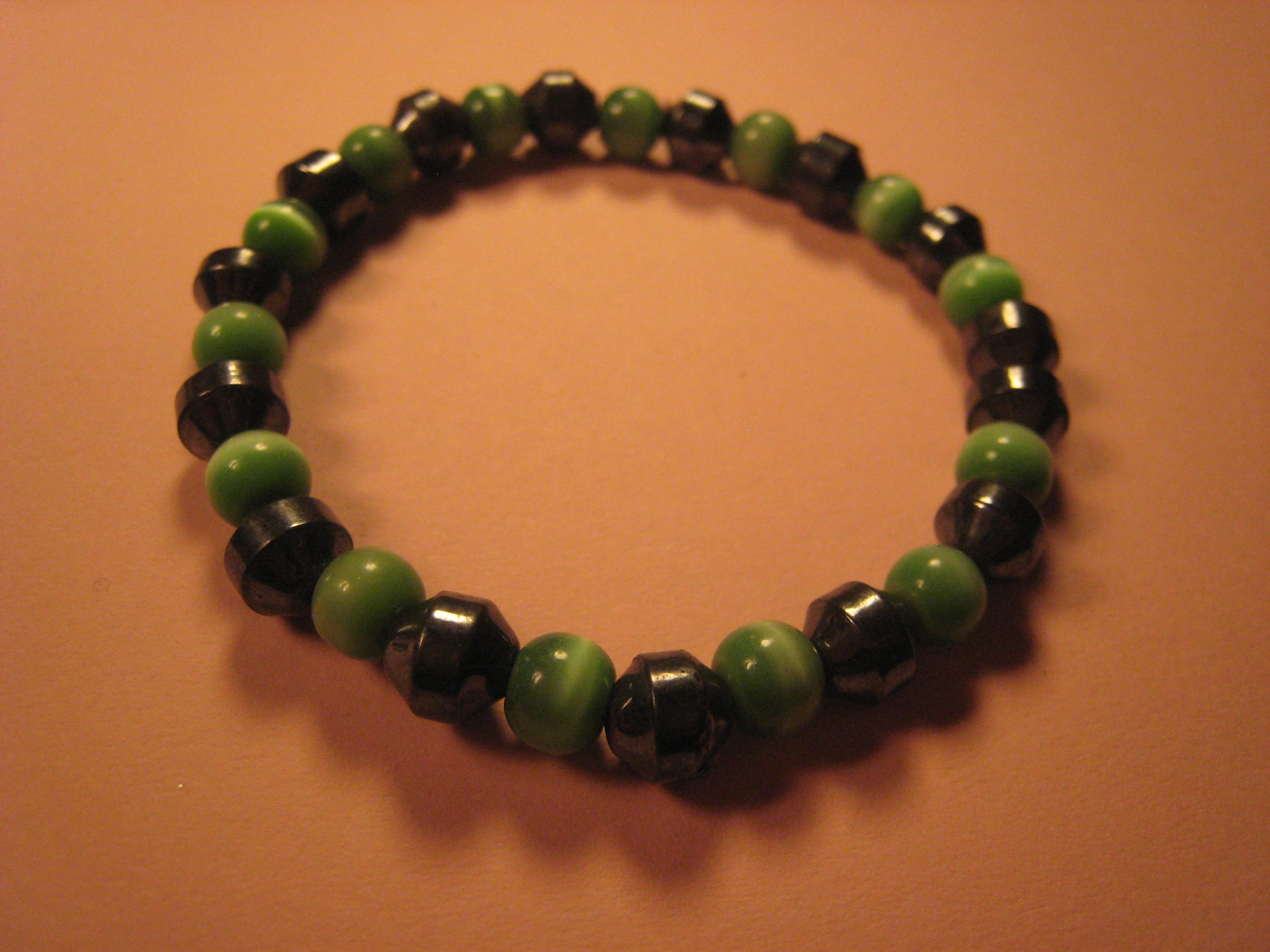 5-7mm round green cat's eye glass and Hemalyke bicone beads make up this 7-inch stretch bracelet which will fit six- to eight-inch wrists.