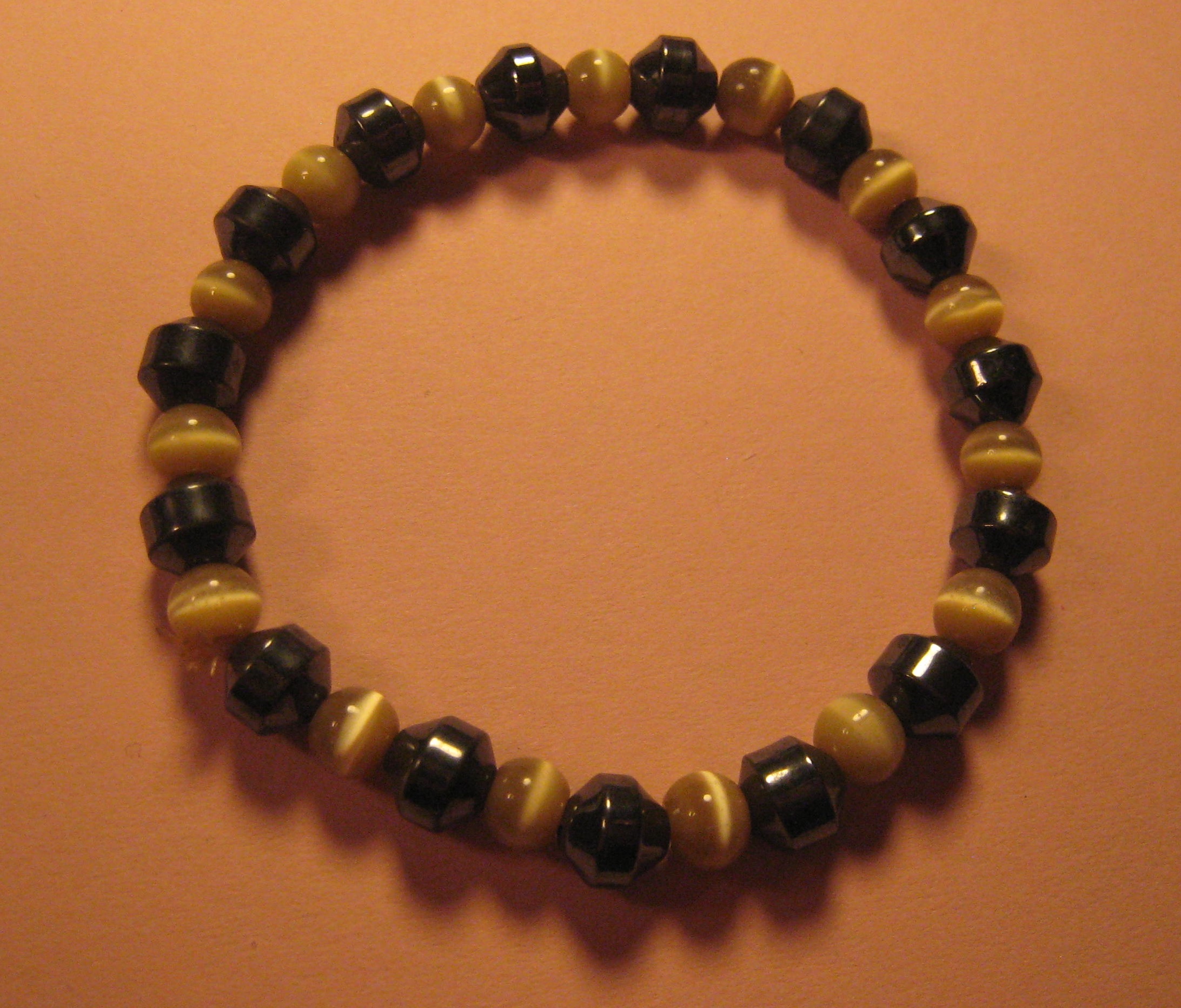 5-7mm round tan cat's eye glass and Hemalyke bicone beads make up this 7-inch stretch bracelet which will fit six- to eight-inch wrists.