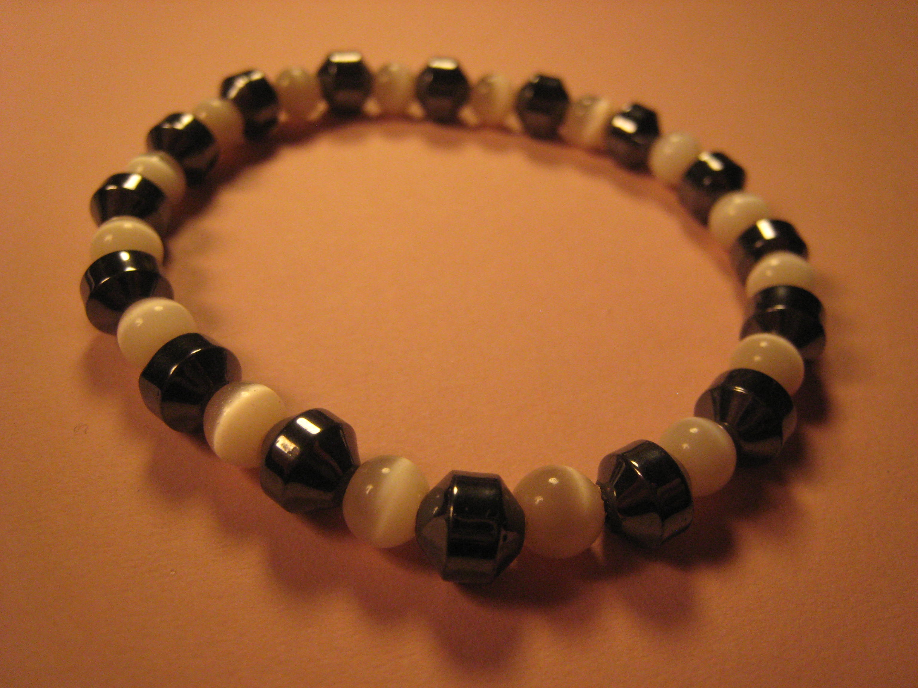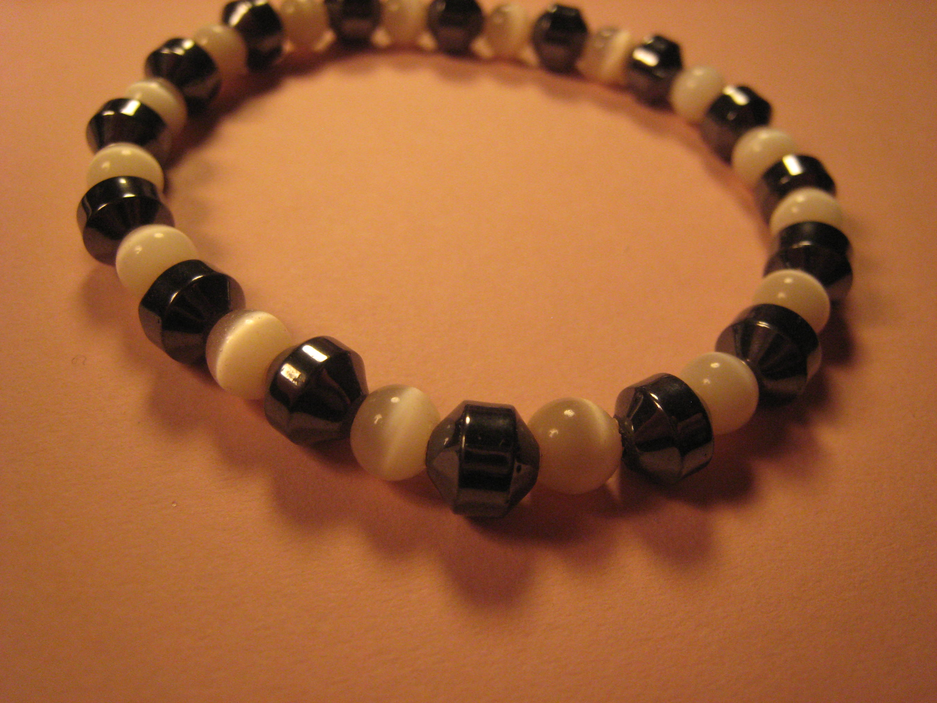 5-7mm round peach cat's eye glass and Hemalyke bicone beads make up this 7-inch stretch bracelet which will fit six- to eight-inch wrists.