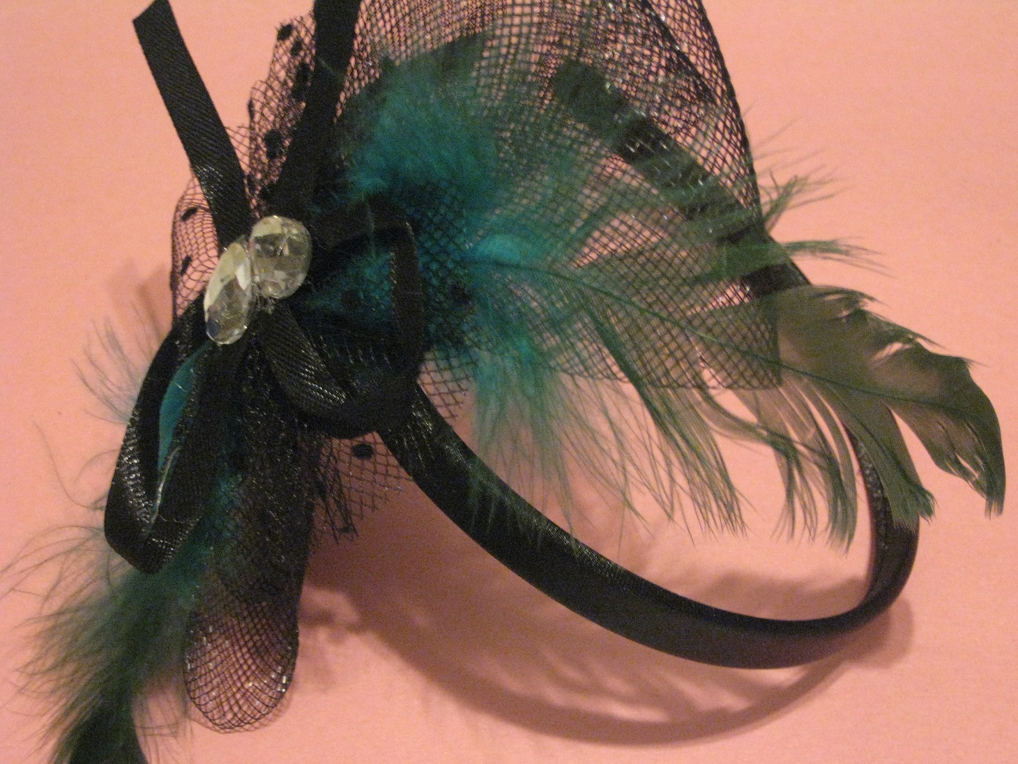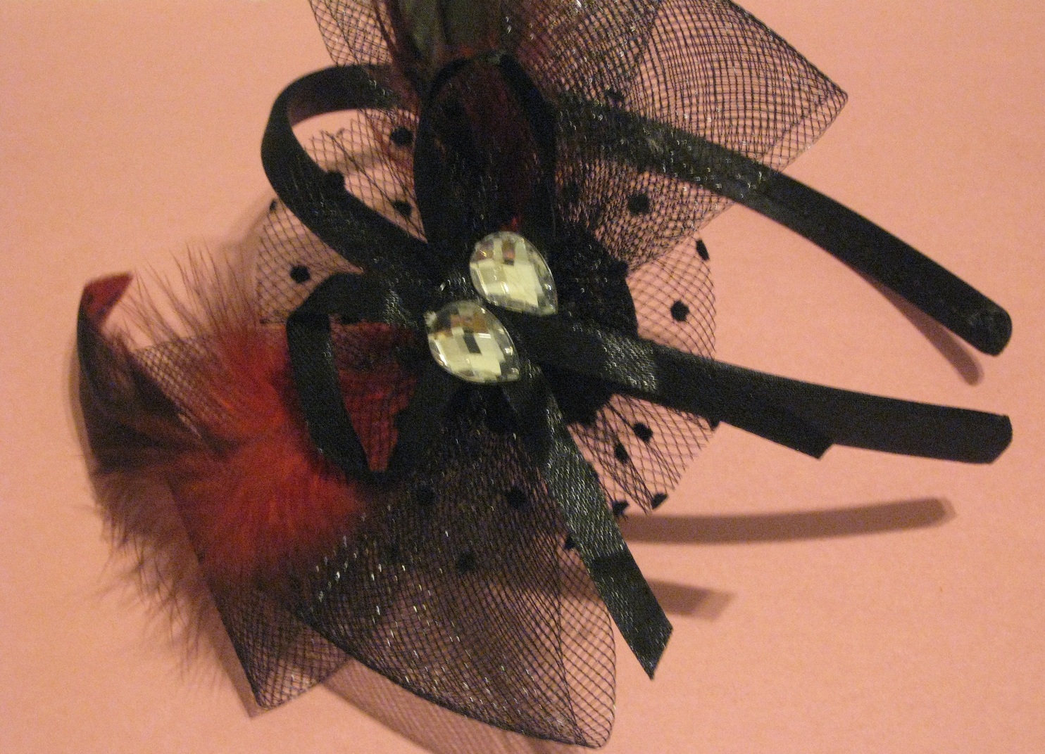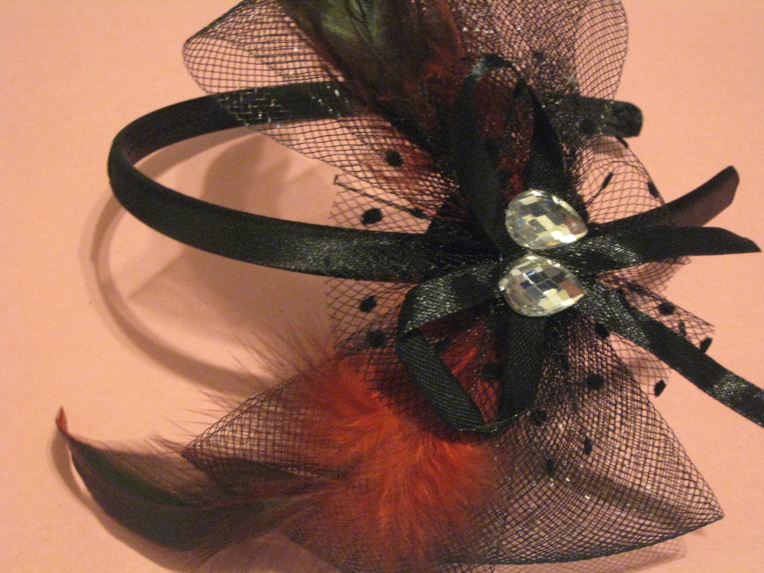 Satin wrapped plastic adult sized headband with colored feathers, acrylic embellishments, and bows made out of mesh organza.