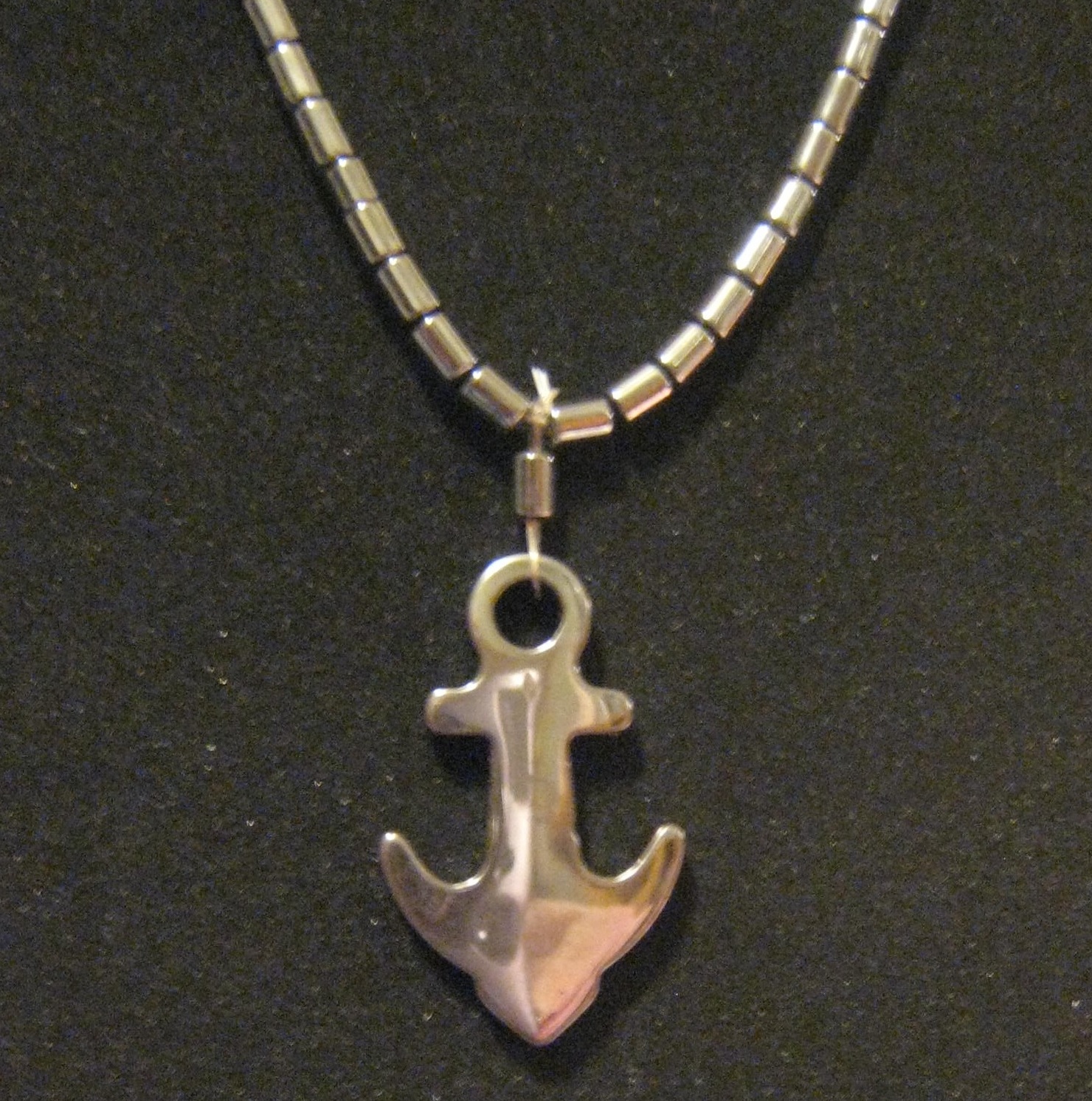 A hemalyke anchor pendant hangs from a hemalyke drum bead necklace, finished with a silver plated steel twist barrel clasp.
