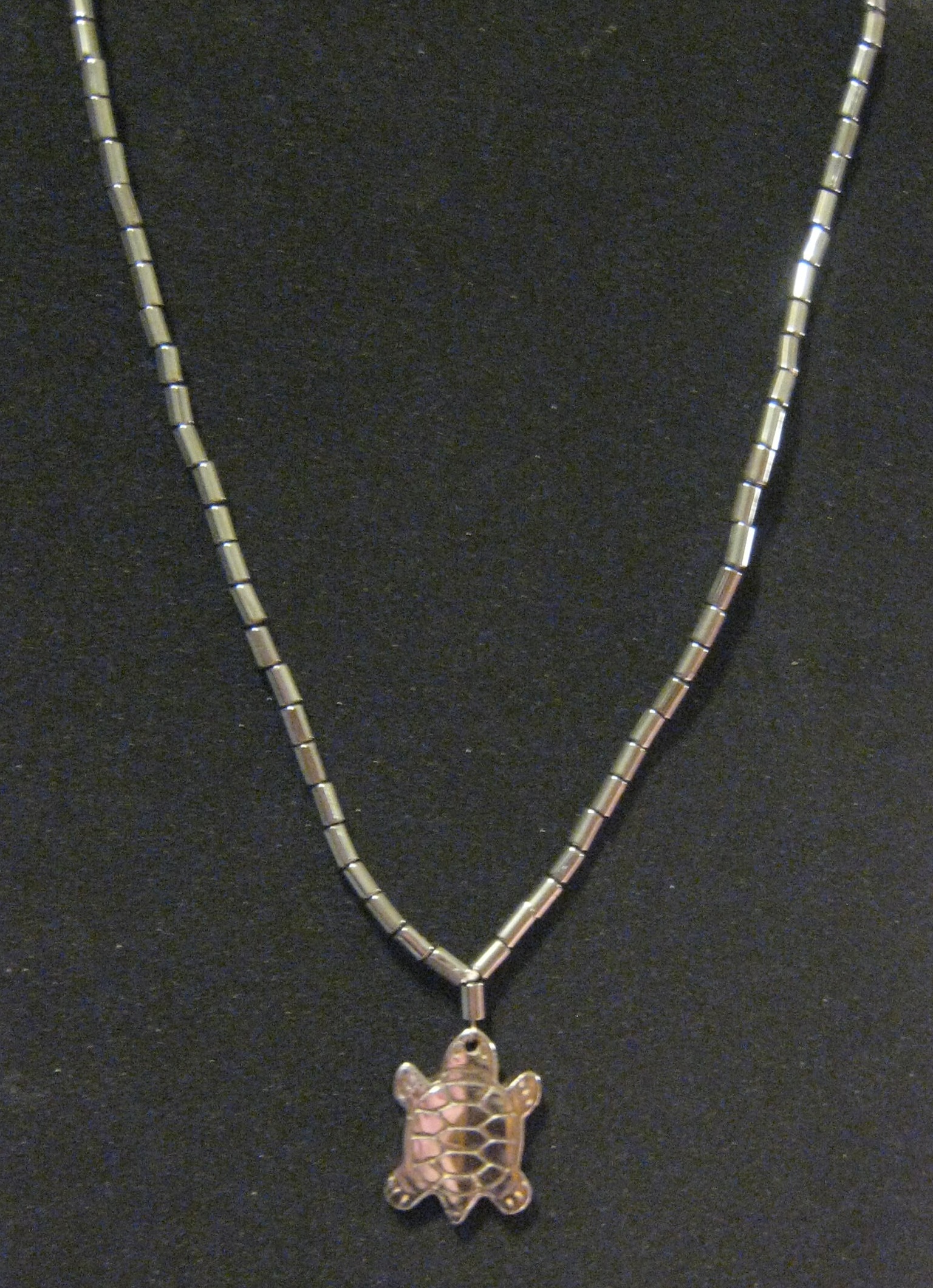 A hemalyke turtle pendant hangs from a hemalyke drum bead necklace, finished with a silver plated steel twist barrel clasp.