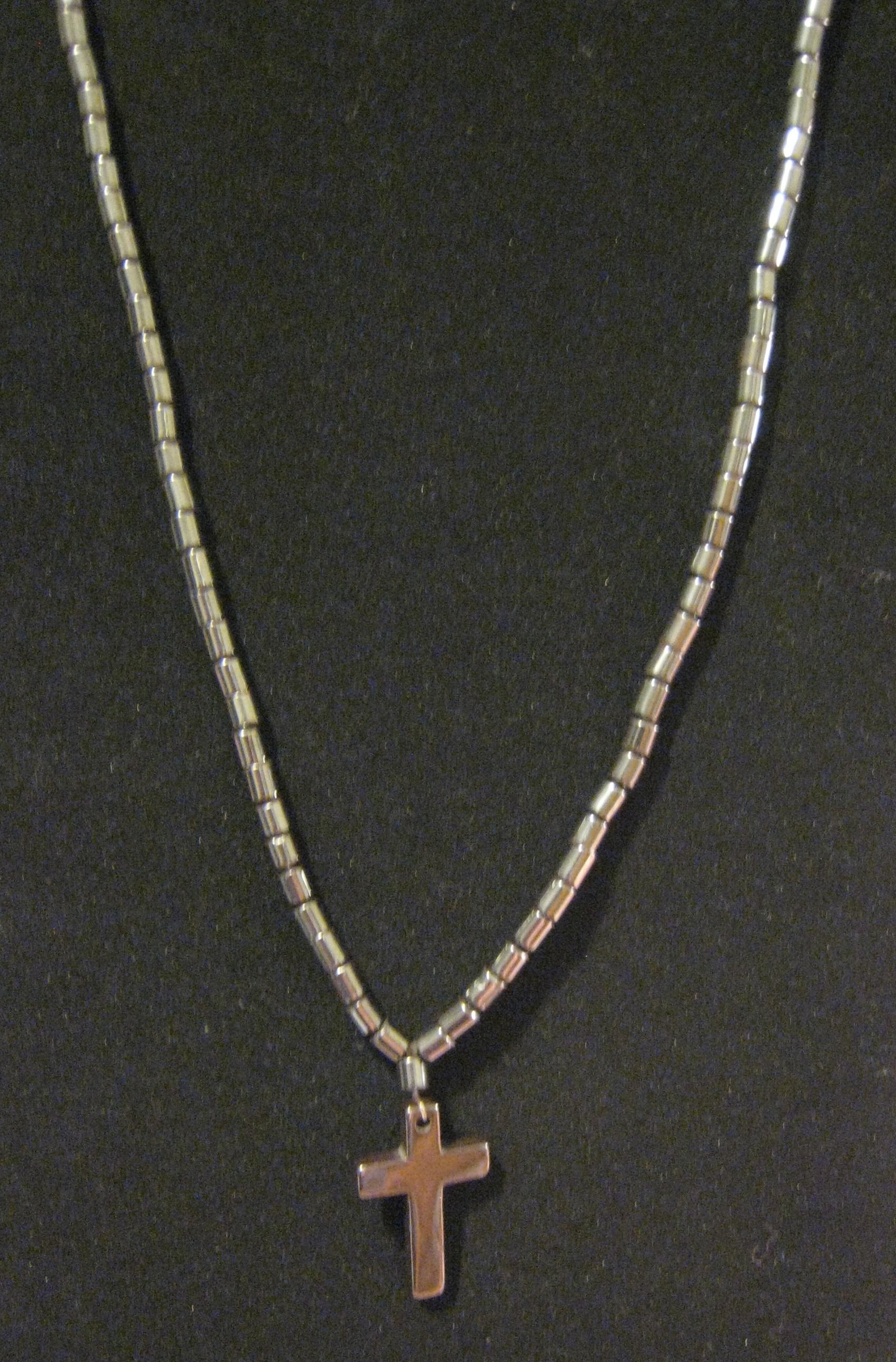A hemalyke simple cross pendant hangs from a hemalyke drum bead necklace, finished with a silver plated steel twist barrel clasp.