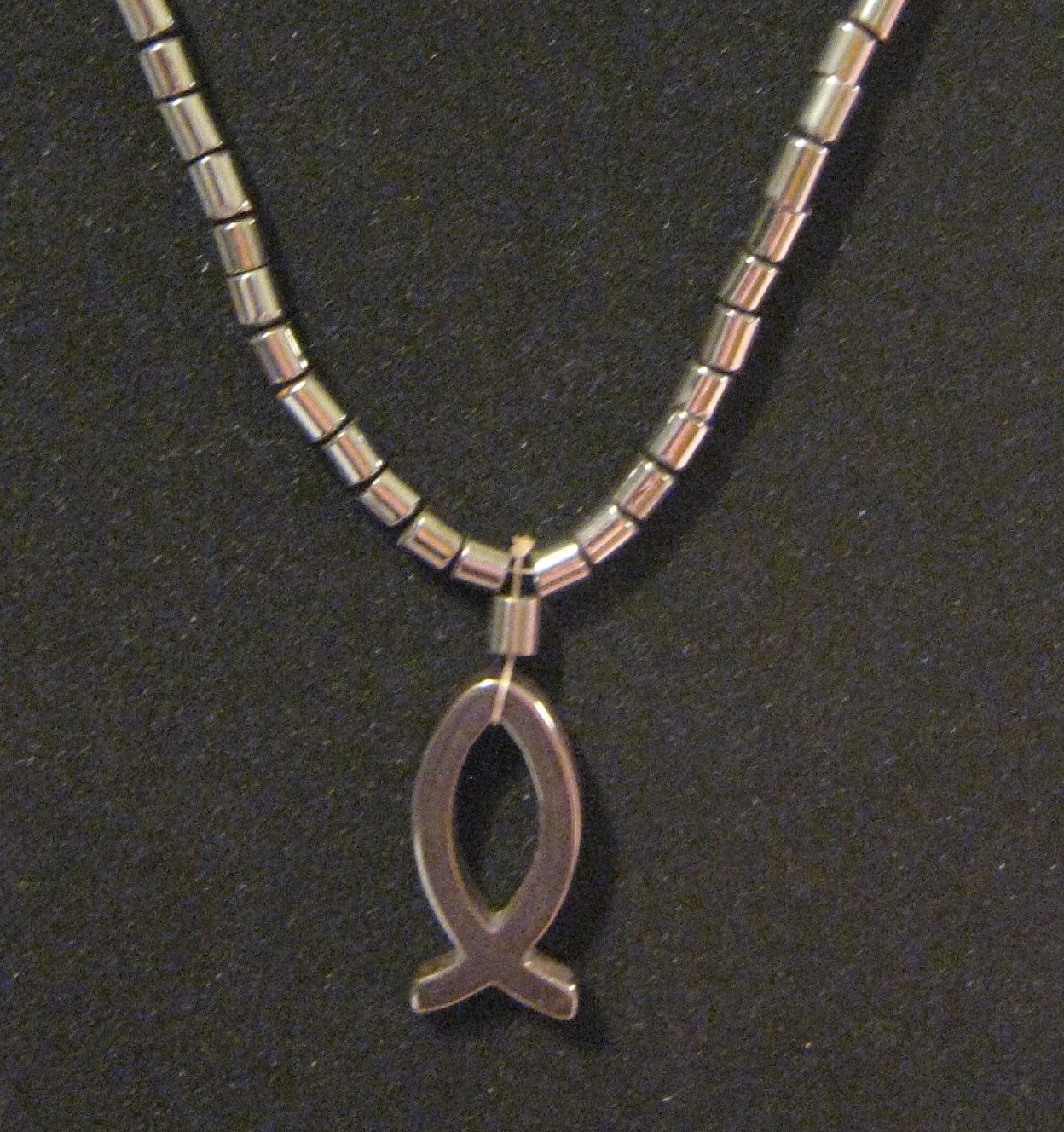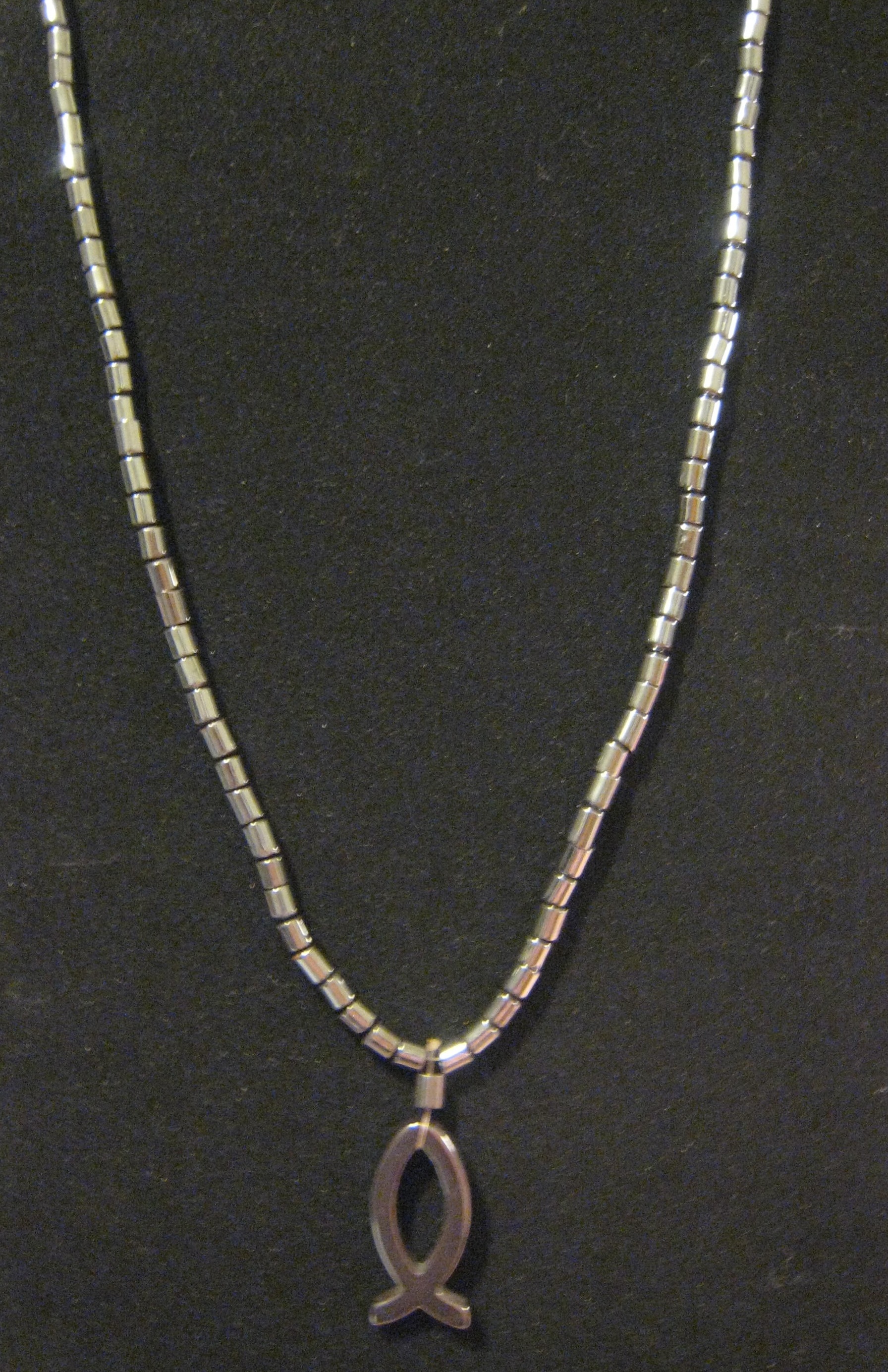 A hemalyke 'ixthus' or fish pendant hangs from a hemalyke drum bead necklace, finished with a silver plated steel twist barrel clasp.