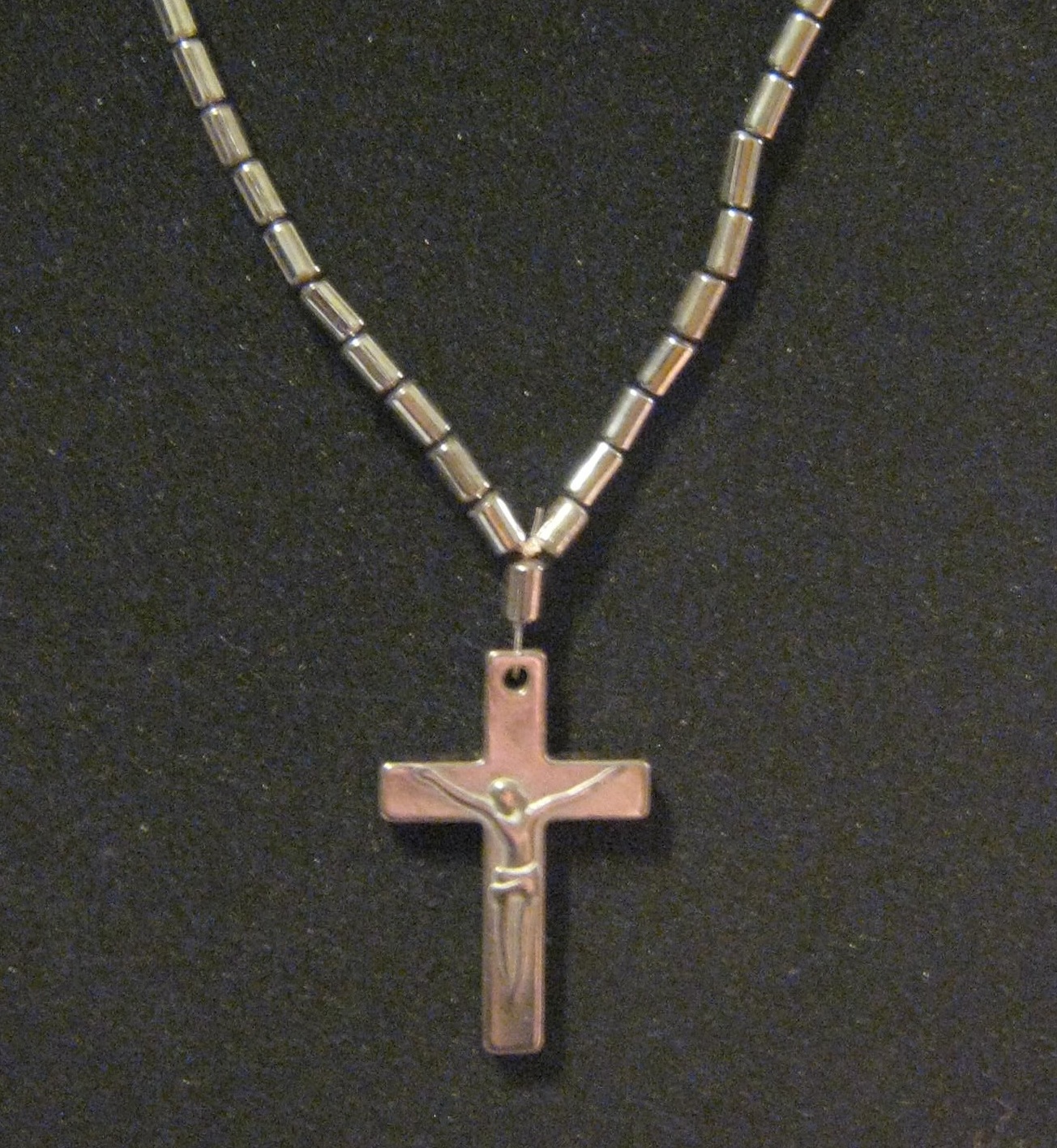 A hemalyke crucifix pendant hangs from a hemalyke drum bead necklace, finished with a silver plated steel twist barrel clasp.