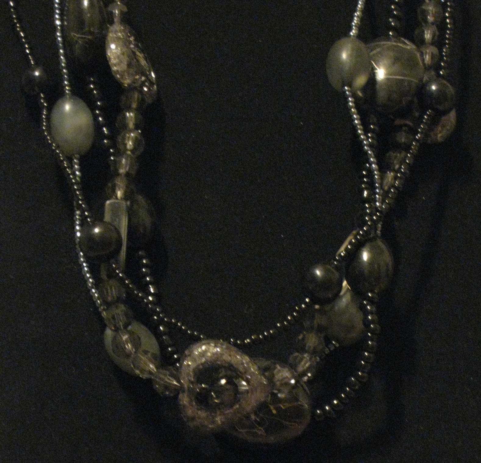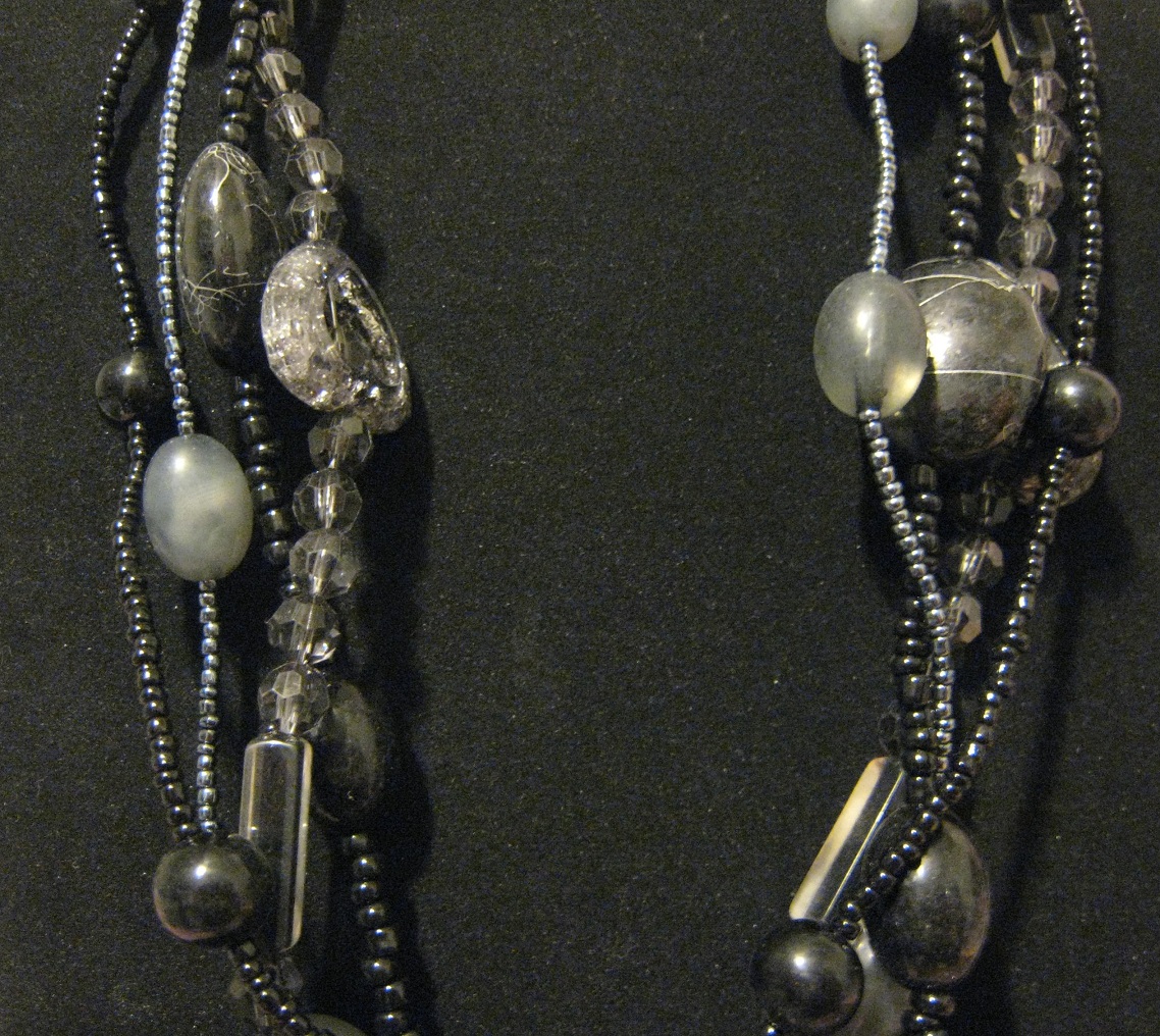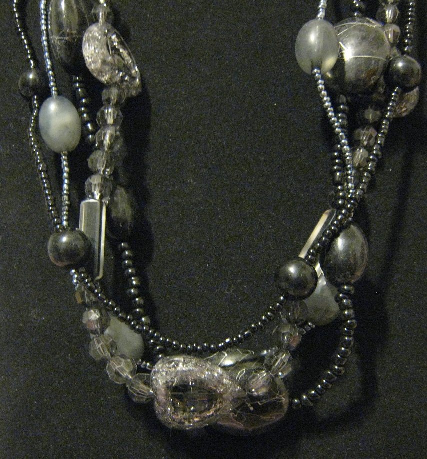 Beautiful acrylic and glass seed beaded necklace has four strands, measures 20" and is finished with a lobster claw clasp and 2" extender.