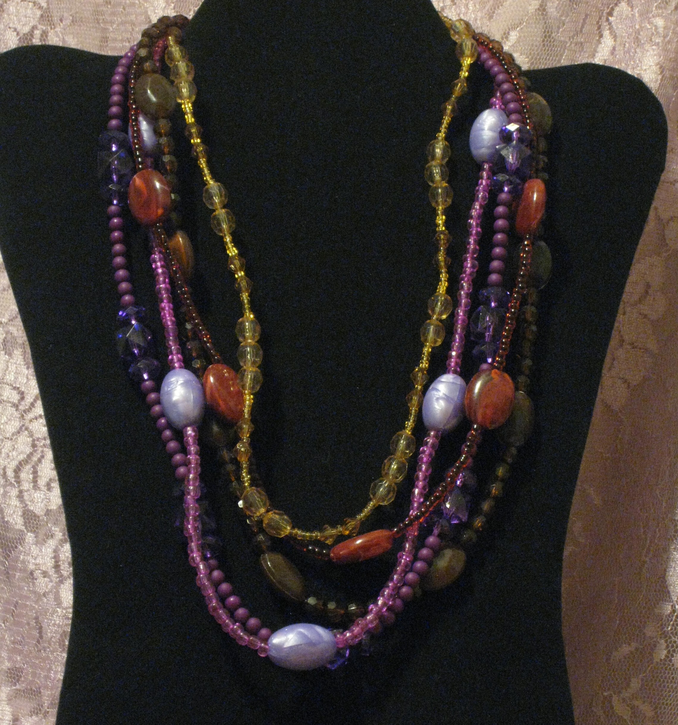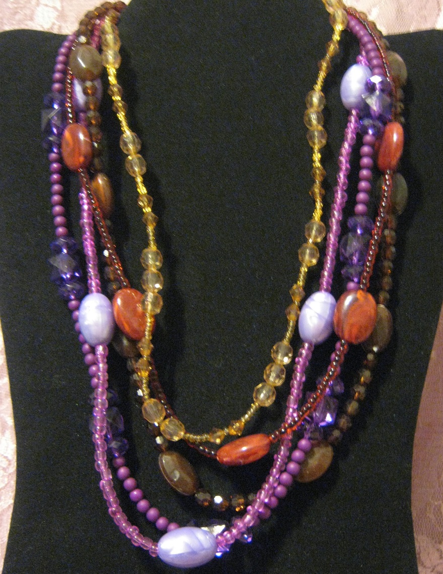 Beautiful purples, reds, browns and yellows acrylic and glass seed beaded necklace has four strands, measures 19" and is finished with a lobster claw clasp and 2" extender.