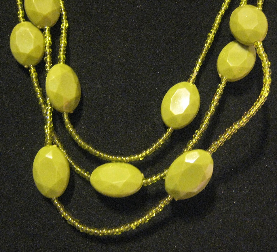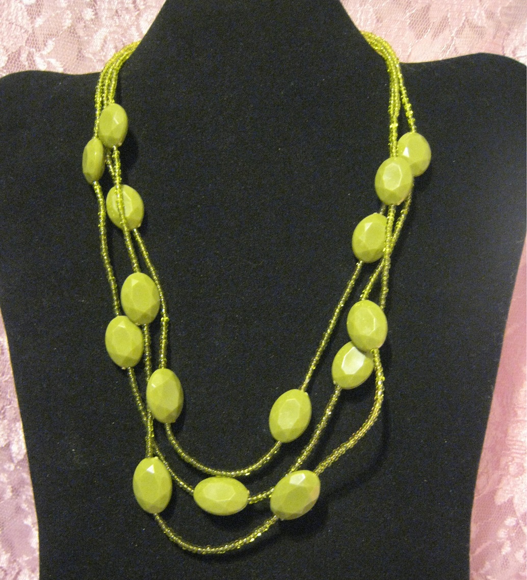 Easy to coordinate mossy green acrylic triple strand necklace. Larger beads measure 20x10mm with 1mm seed beads, Necklace measures 20"L with 3"extender.