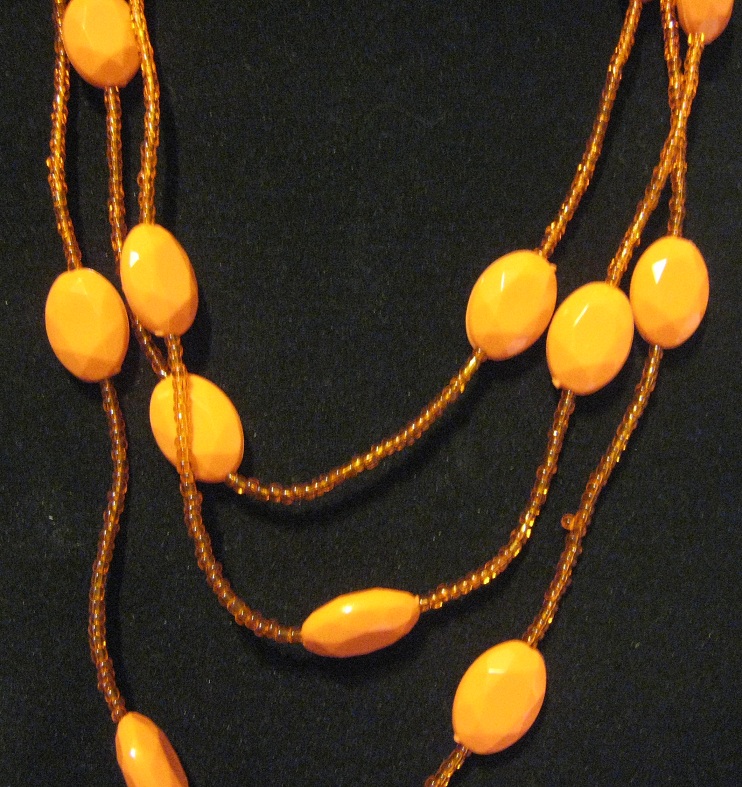 Easy to coordinate orange acrylic triple strand necklace. Larger beads measure 20x10mm with 1mm seed beads, Necklace measures 20"L with 3"extender.