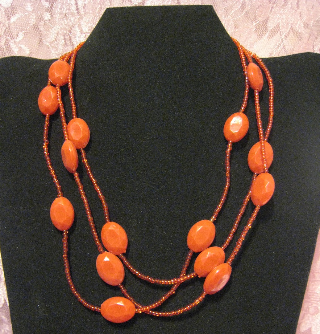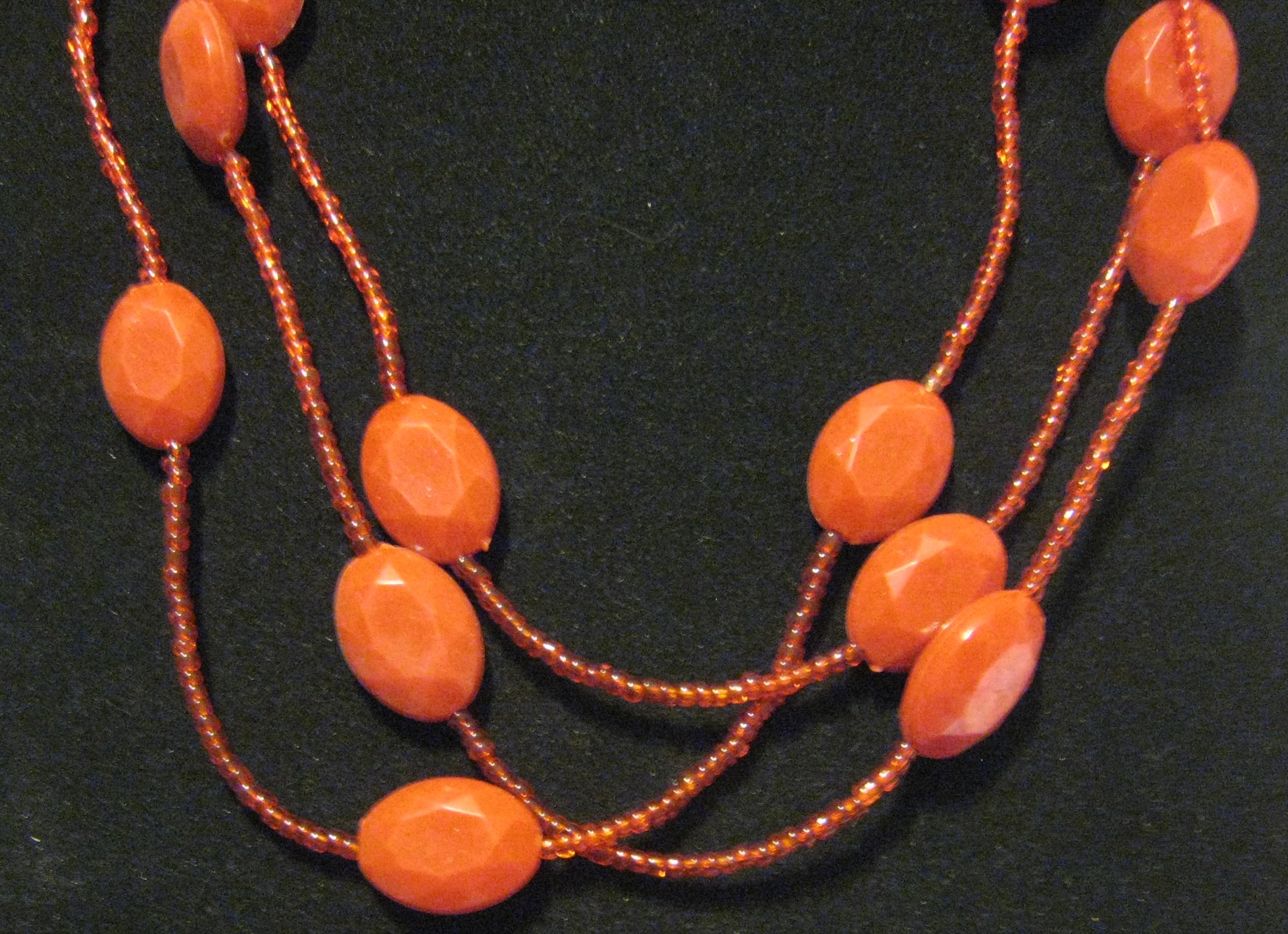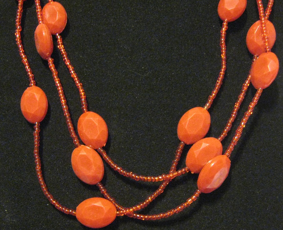 Easy to coordinate tomato red acrylic triple strand necklace. Larger beads measure 20x10mm with 1mm seed beads, Necklace measures 20"L with 3"extender.