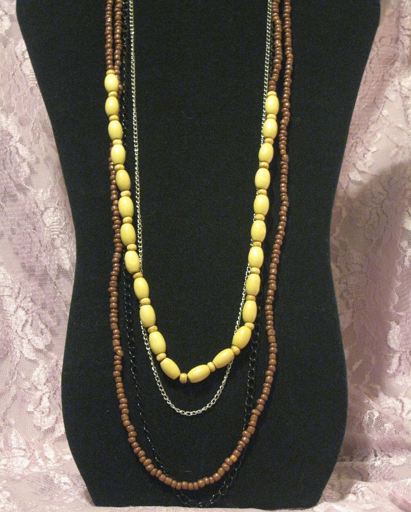 Tan wood beads, brown seed beads, silver chain and a black chain make up this necklace ensemble.