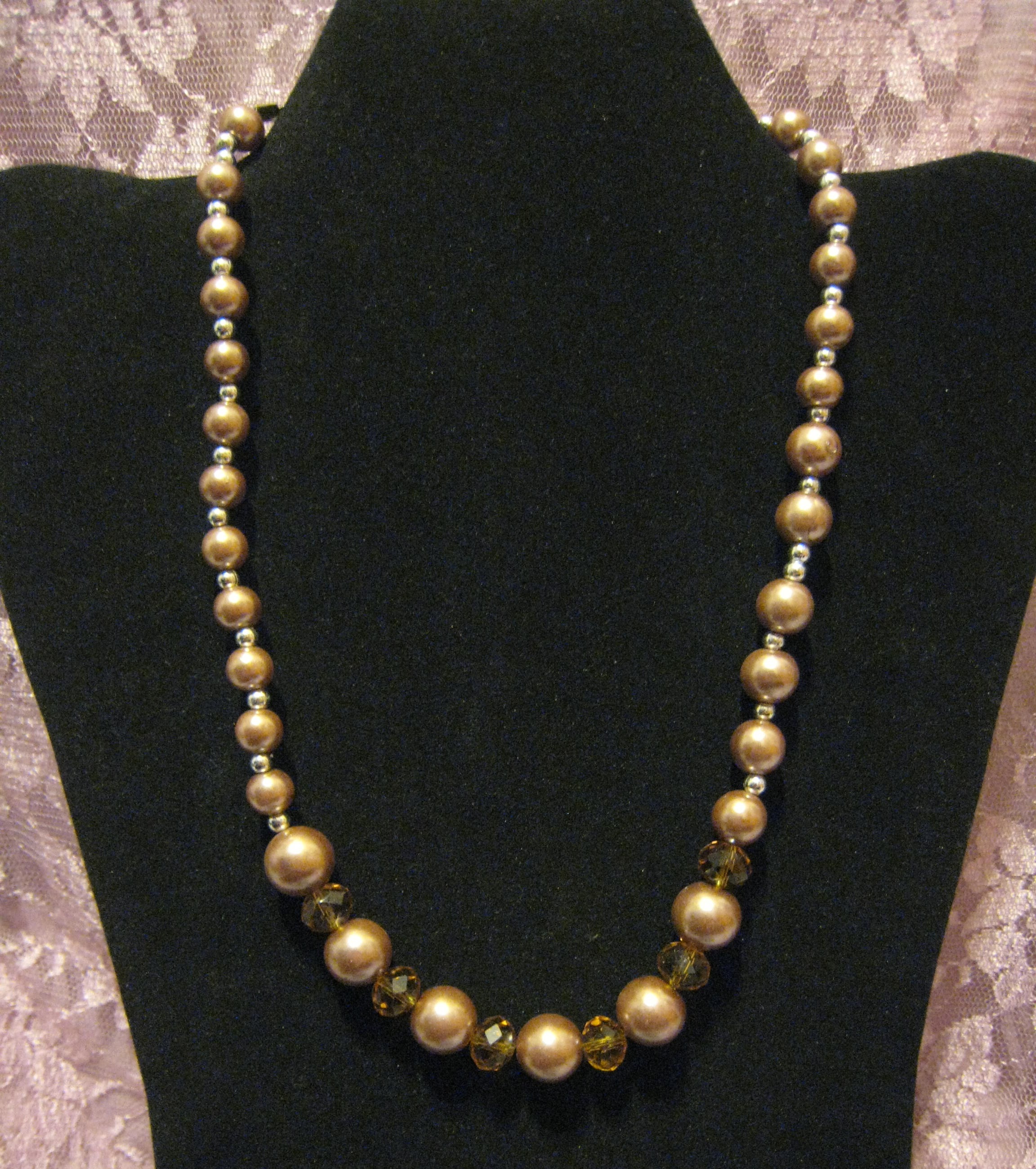 This beautiful necklace is made out of Cultura glass pearls with silver acrylic spacer beads and faceted glass beads. The necklace measures 17" long with a lobster claw clasp and has a 2" extender.