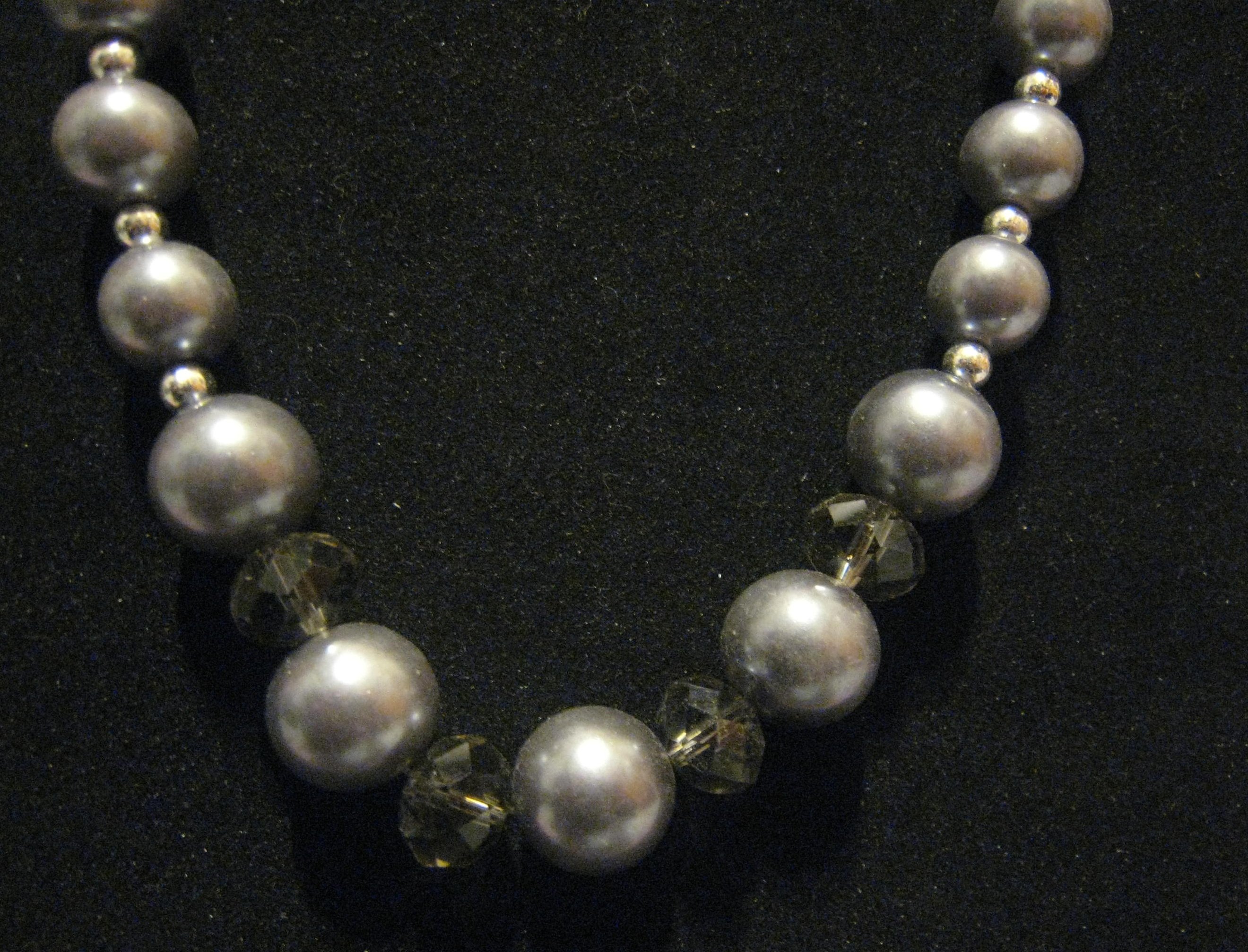 This beautiful necklace is made out of Cultura glass pearls with silver acrylic spacer beads and faceted glass beads. The necklace measures 17" long with a lobster claw clasp and has a 2" extender.