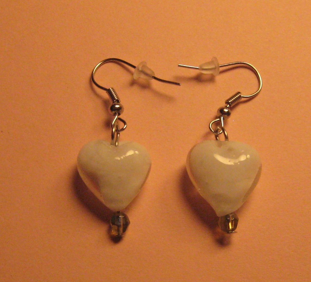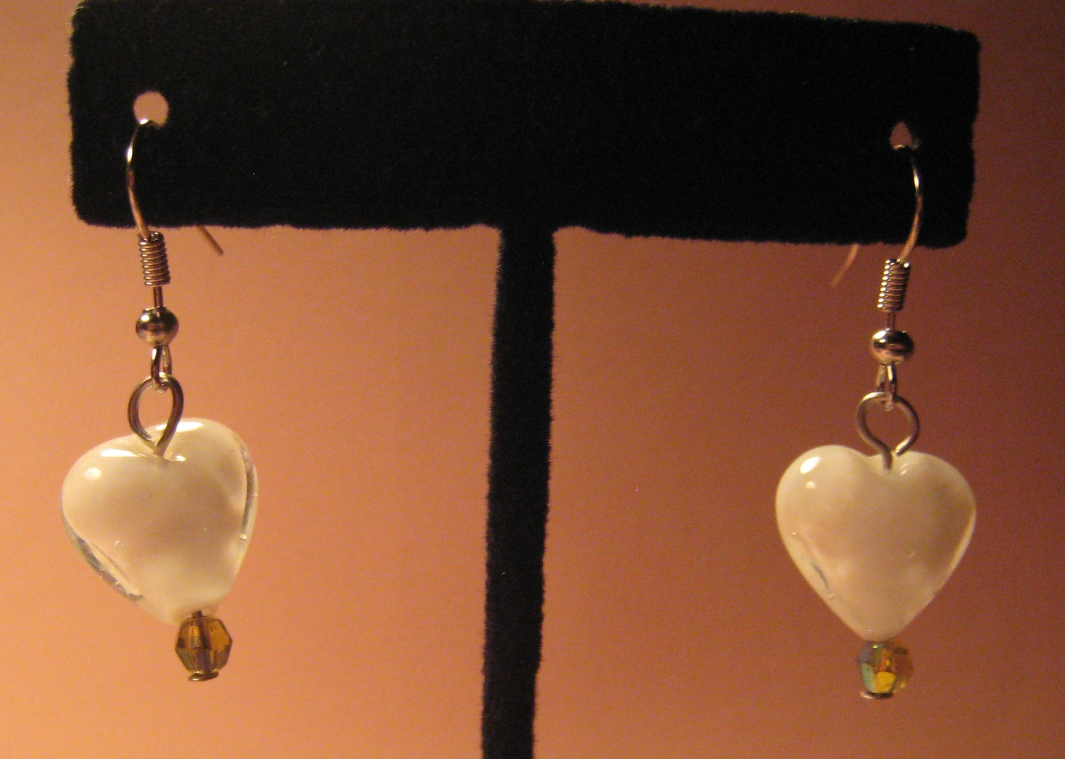 Adorable handmade glass earrings measure 1 1/2" long and have a steel fishhook earwire.