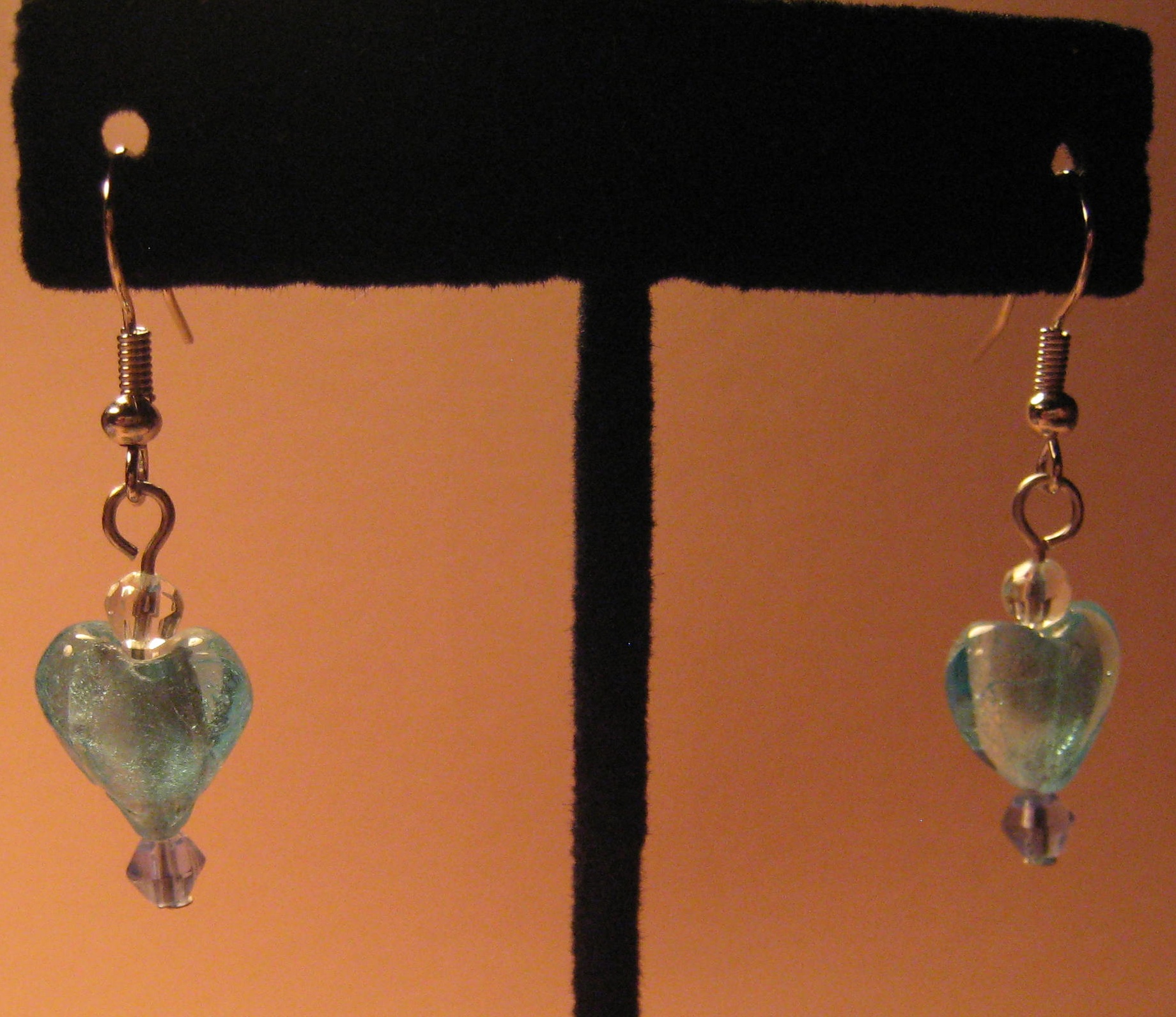 Adorable handmade glass earrings measure 1 1/2" long and have a steel fishhook earwire.