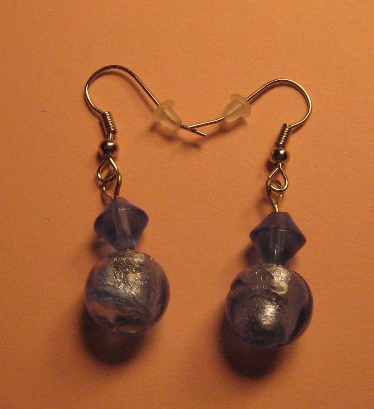 Adorable handmade glass earrings measure 1 1/2" long and have a steel fishhook earwire.