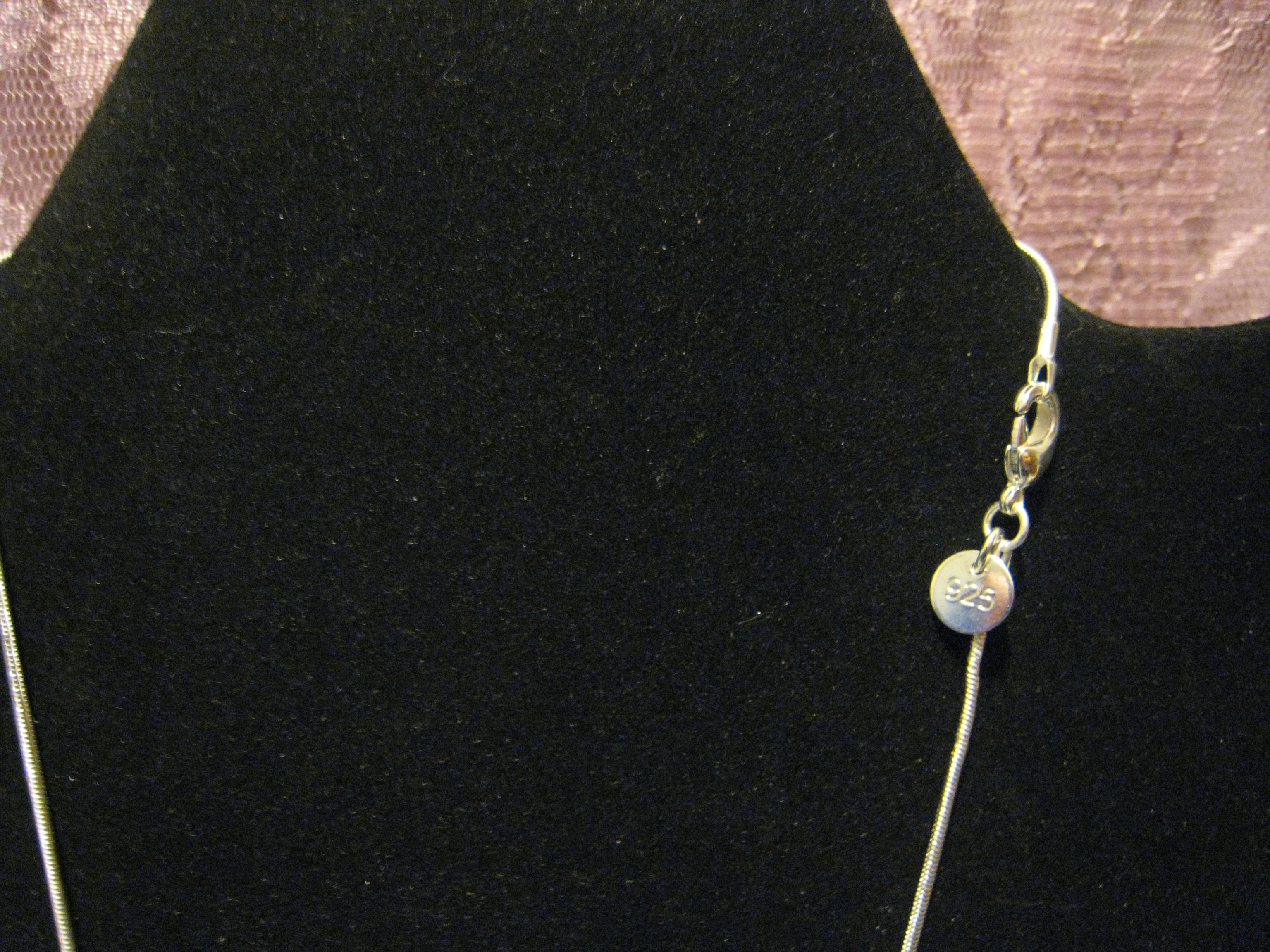 Silver plated wire wrapped 20x25mm diamond shaped design on a sterling silver filled 17" snake chain necklace.