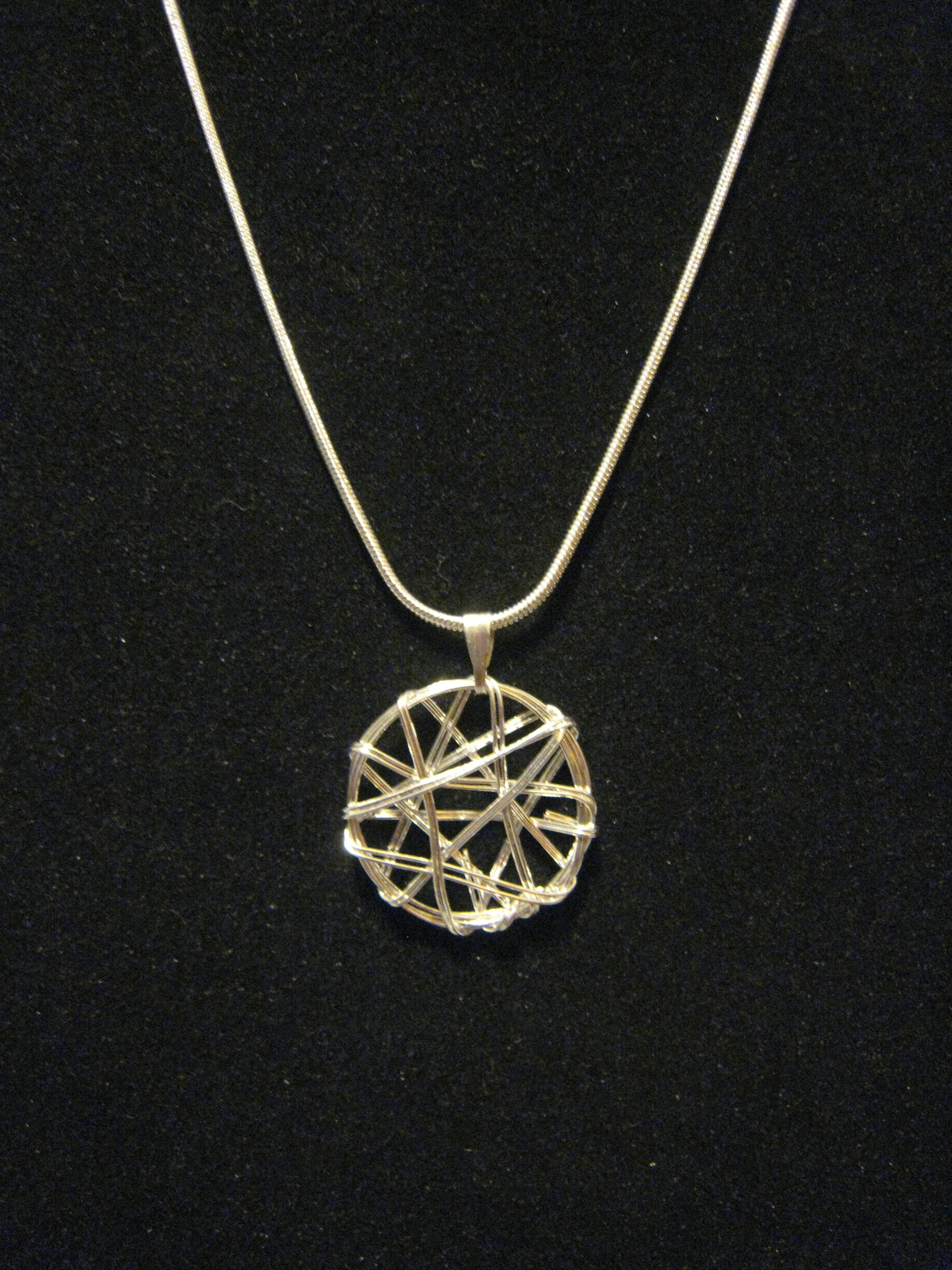 Silver plated wire wrapped 21mm circle encasing a star design on a sterling silver filled 16" snake chain necklace.