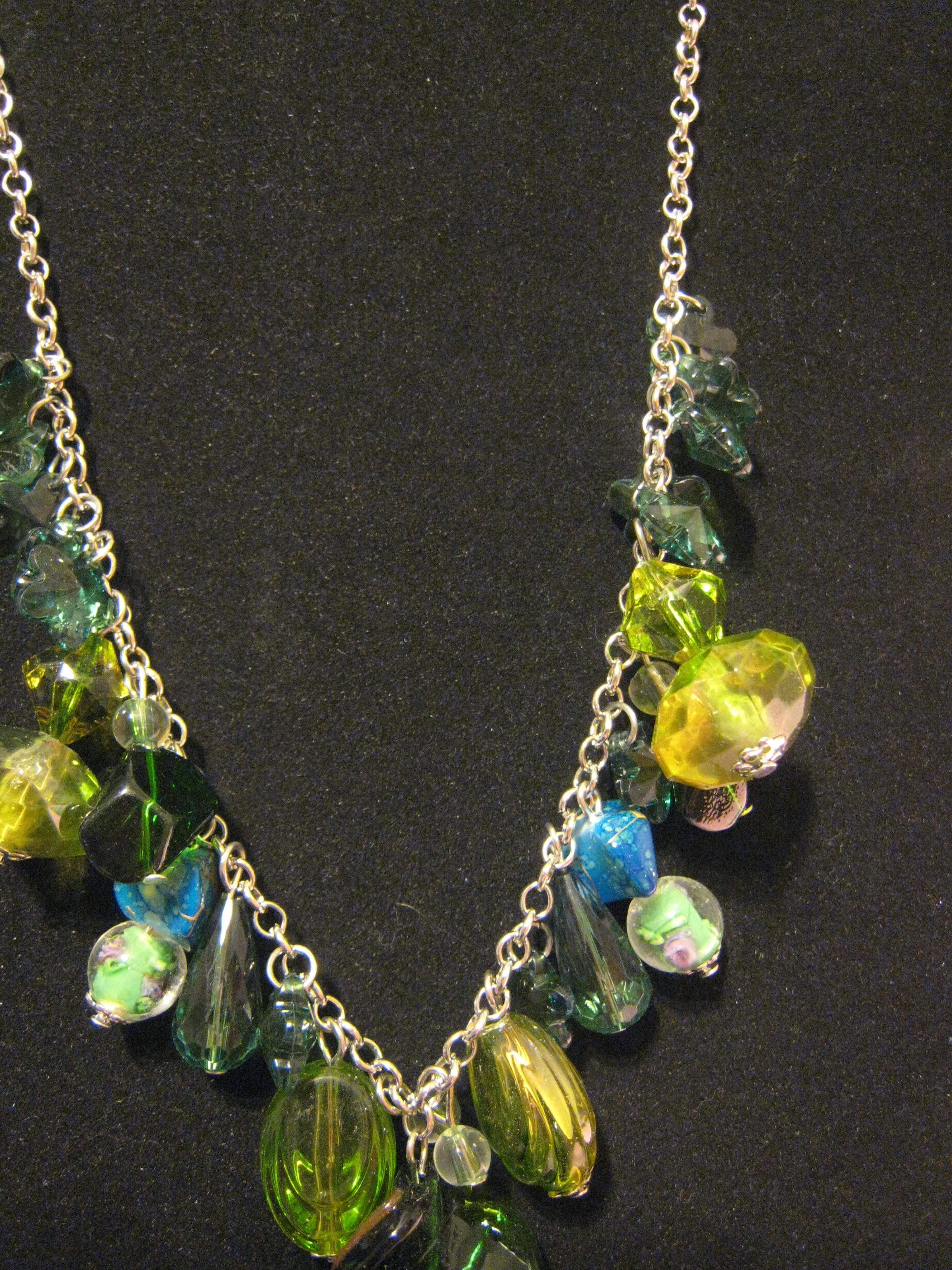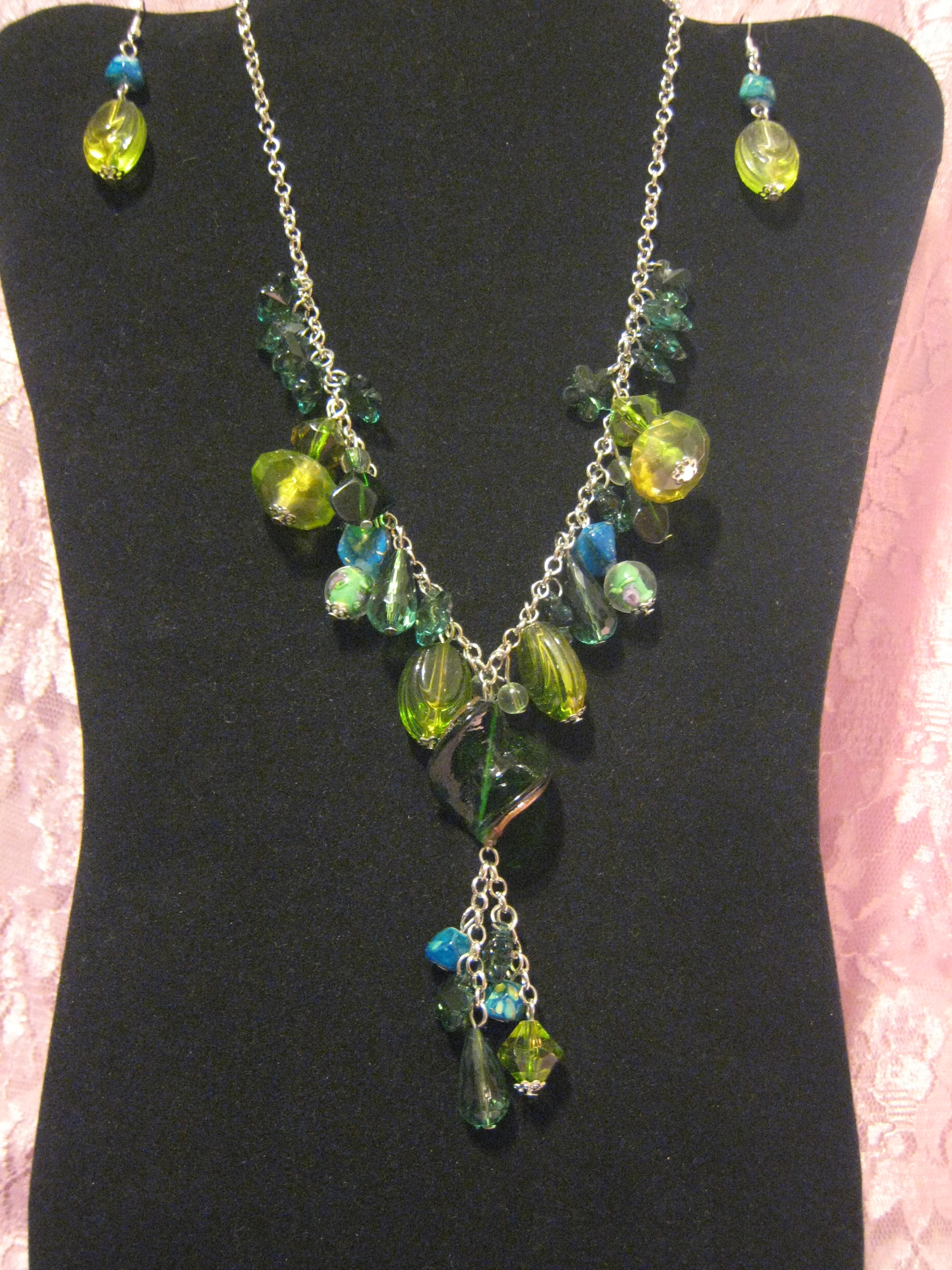 Beautiful teal and lime glass beads dangle from a single silver plated steel chain creating an unique ensemble. Matching dangle earrings complete the set.