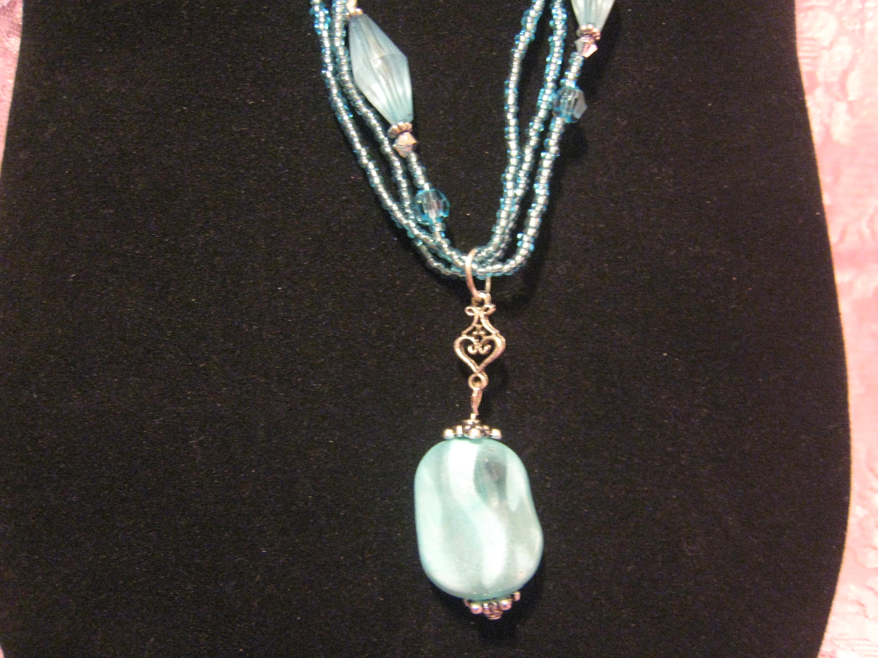 Blue acrylic and glass seed beads make up this beautiful necklace that measures 24" with a 2" extender. The earrings measure just over an inch and have steel fishhook earwires.