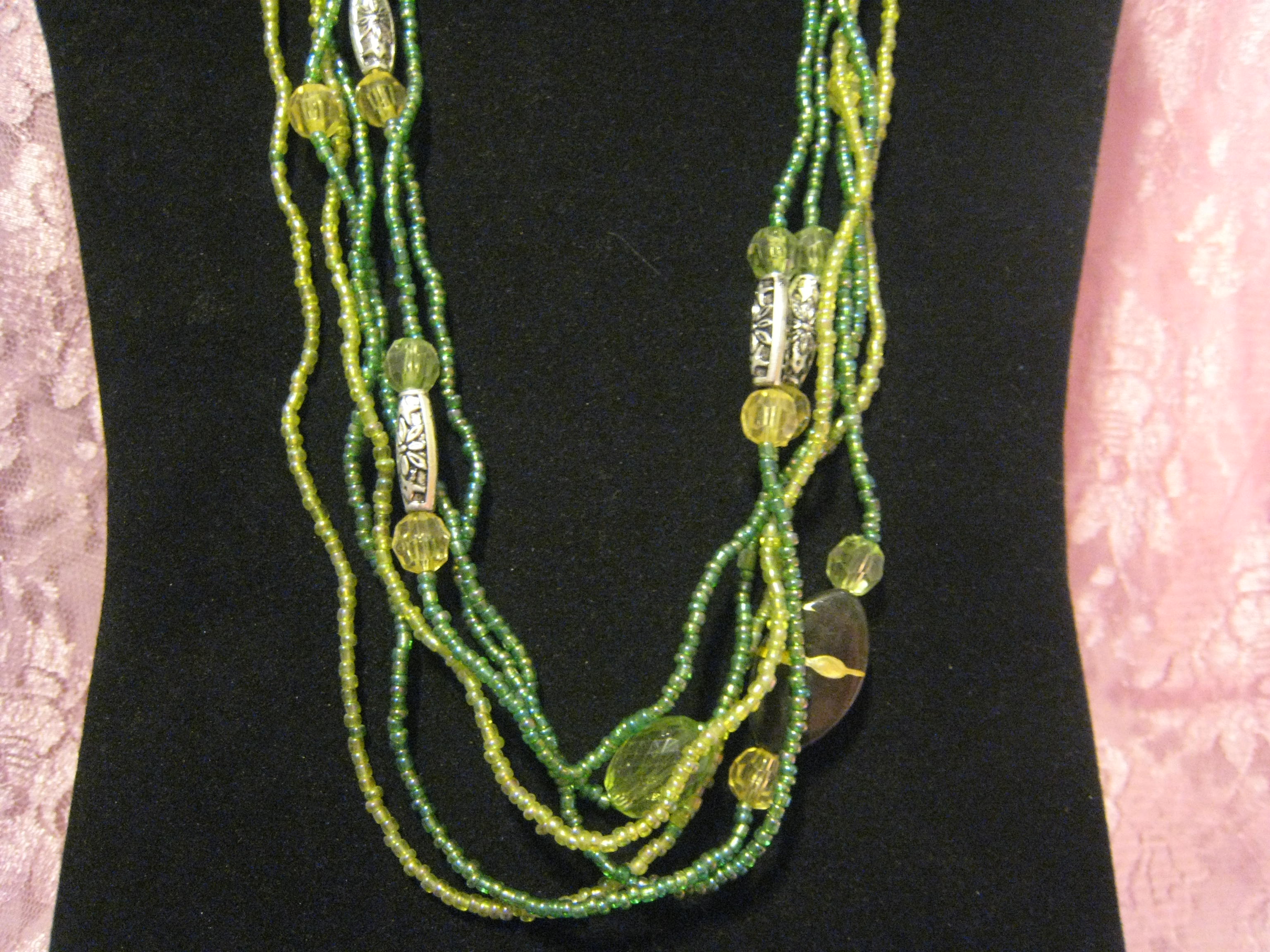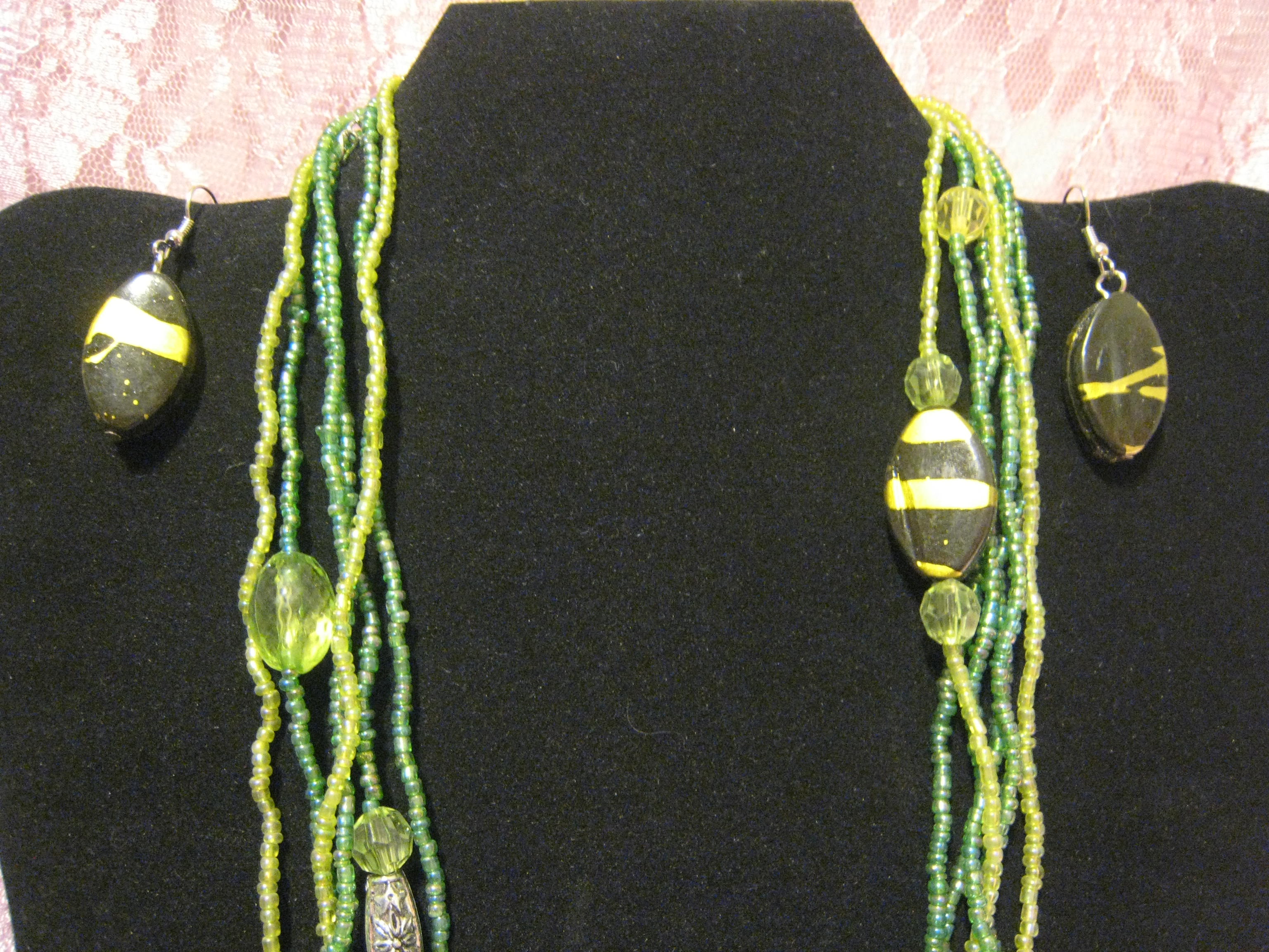 Beautiful shades of green acrylic and glass with acrylic silver highlight beads make up this 22" continuous loop necklace. Matching earrings are over an inch long and have steel fishhook earwires.