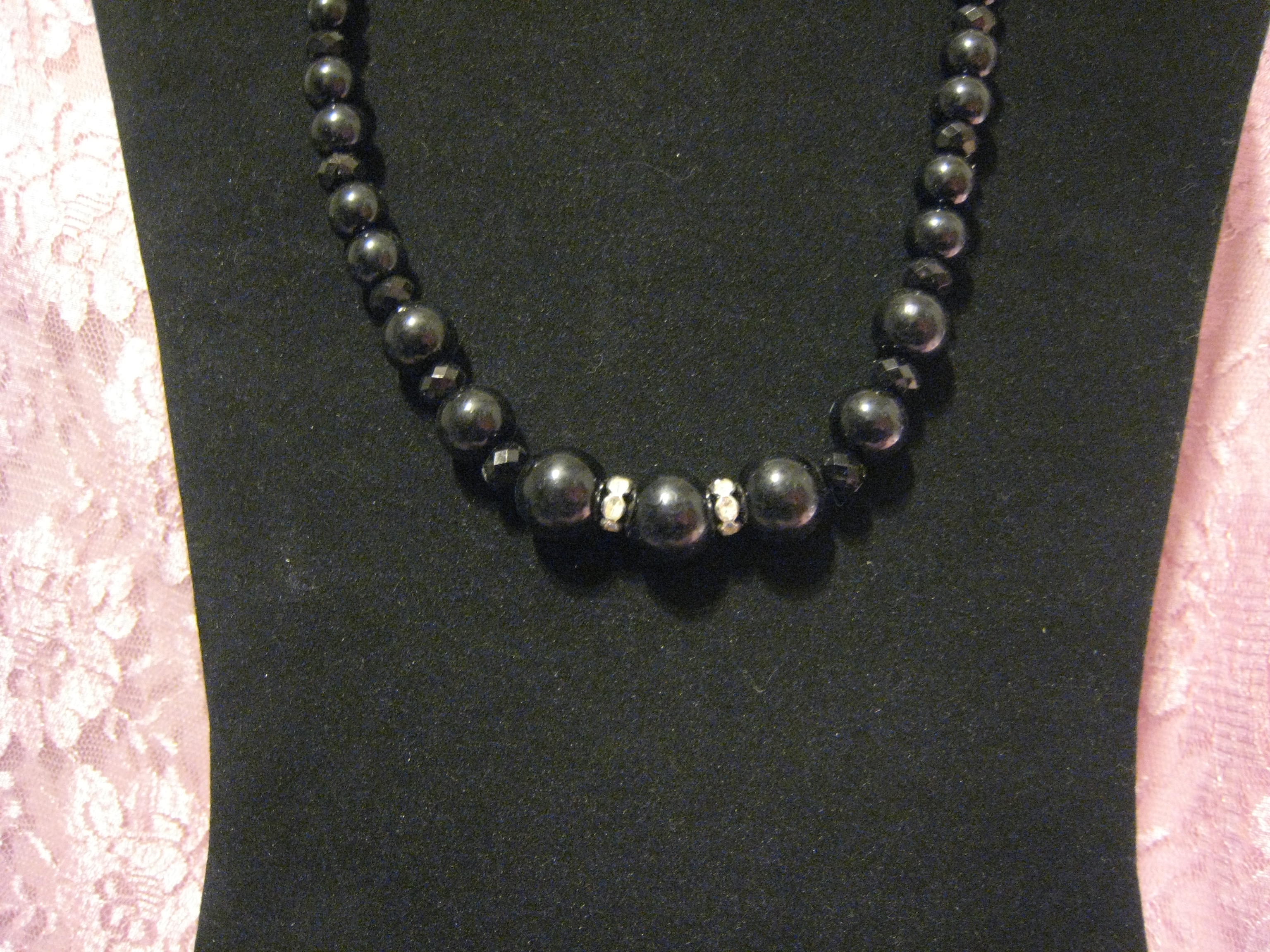Strung Cultura glass pearls with acrylic crystals and rhinestone encrusted rondelle beads make up this beautiful piece.