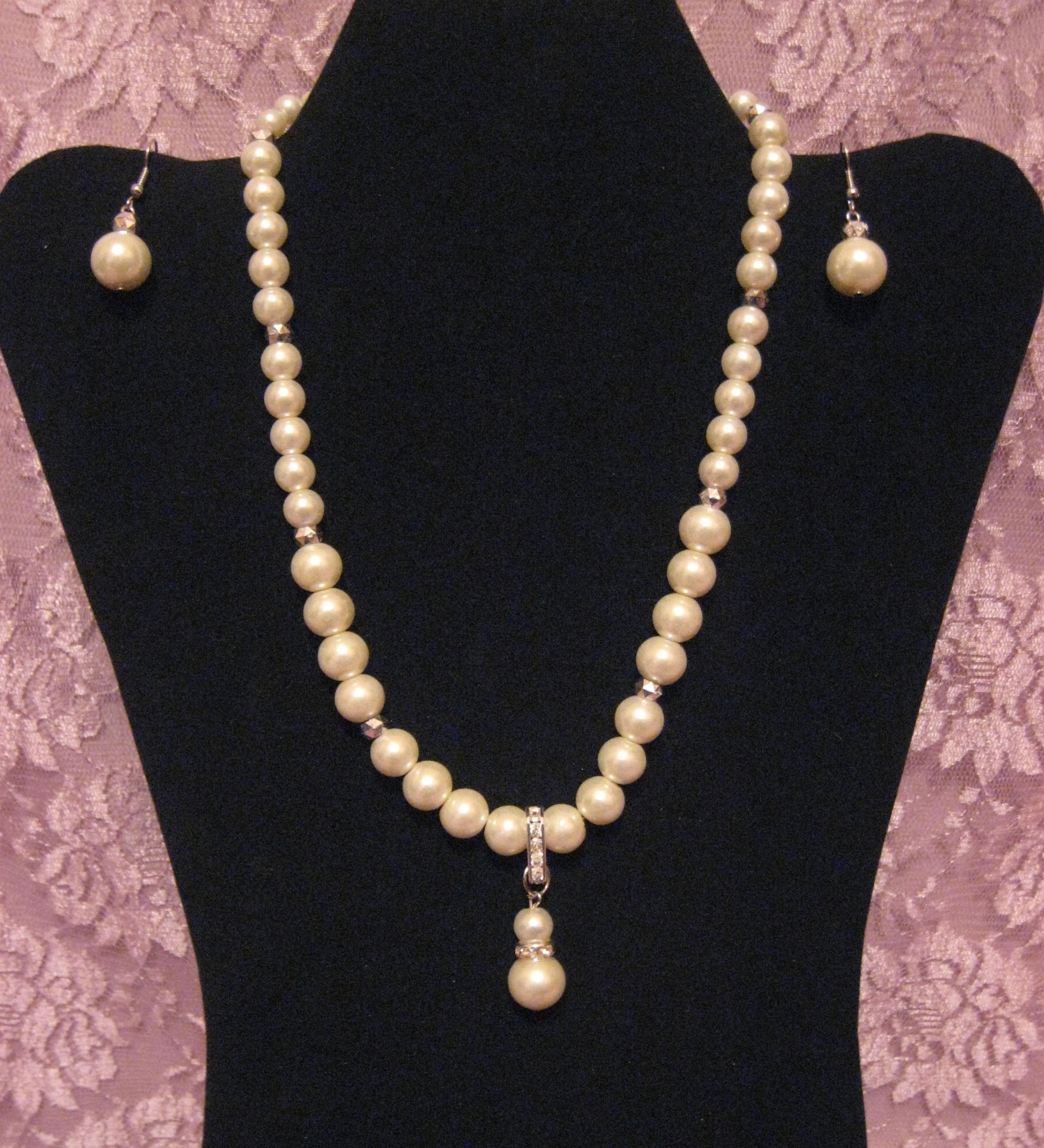 Cream Glass Pearl & Crystal Necklace Set