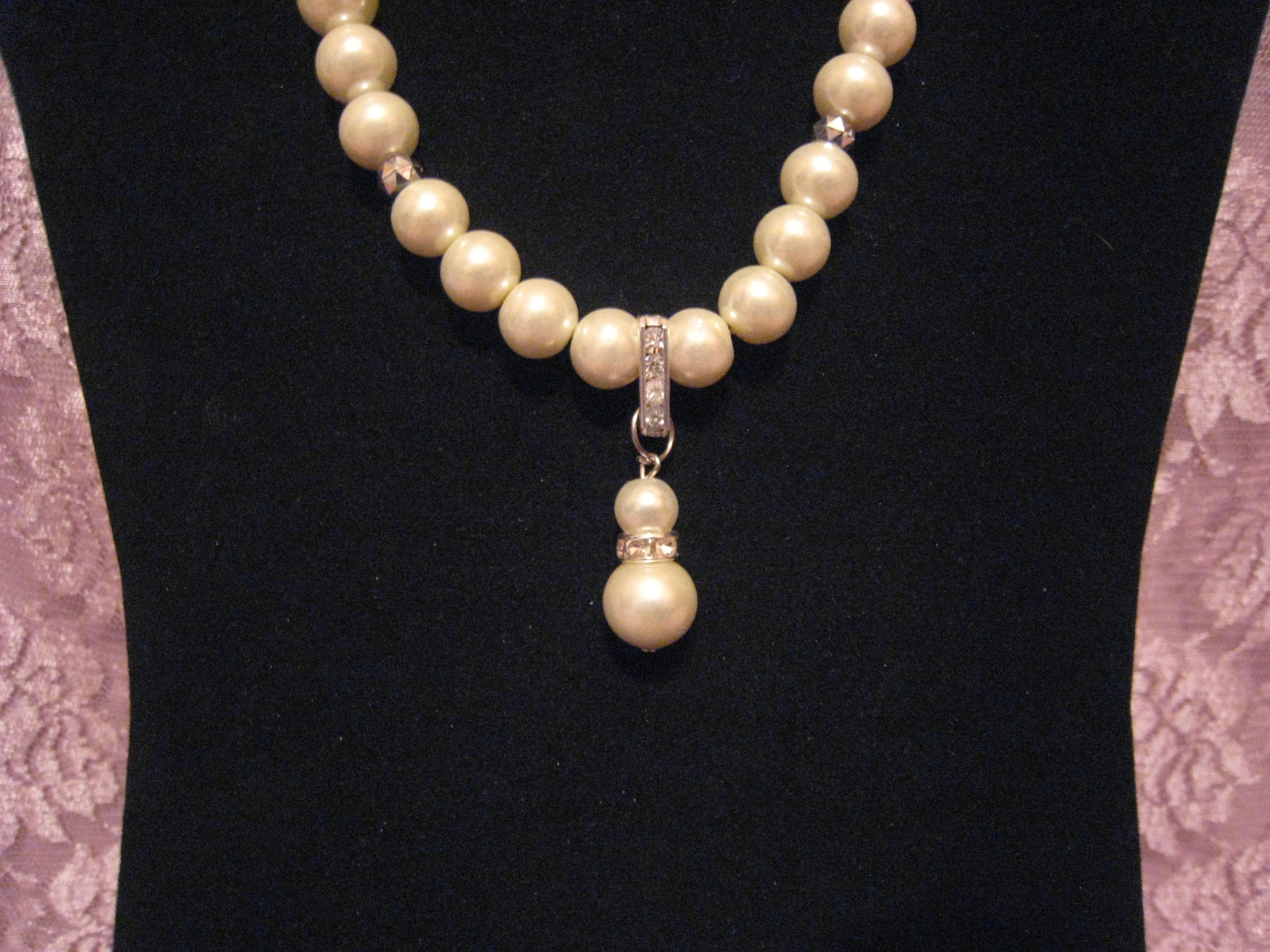 Strung Cultura glass pearls with acrylic spacers and rhinestone encrusted rondelle beads make up this beautiful piece.
