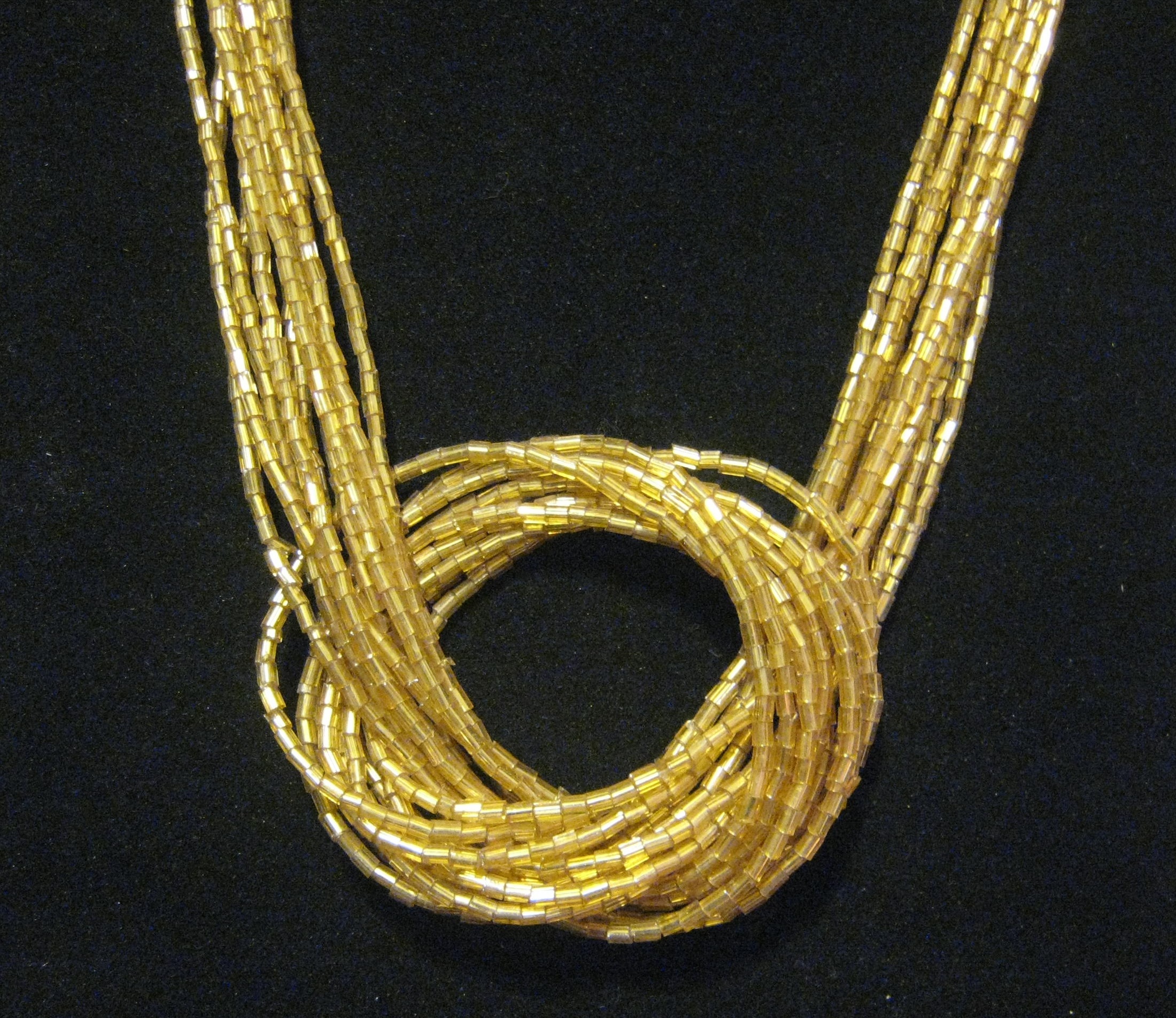 10 rows of shimmery gold colored glass seed beads are crossed over in the center to form a knot pattern then finished with a lobster claw clasp and 2" extender. Necklace measure 18-20 inches when finished, depending on how worn, and how tight the knot is. You can make the knot tighter or loser to your preference. The earrings measure approximately 2" long and are finished with steel fishhook earwires.