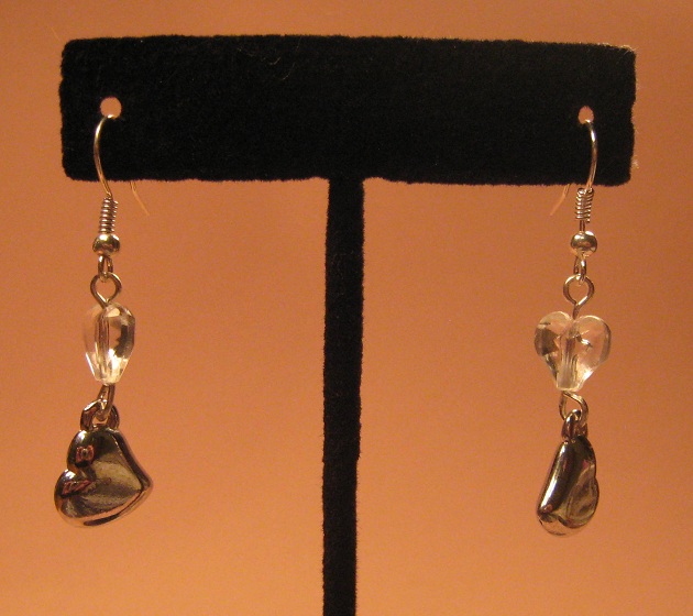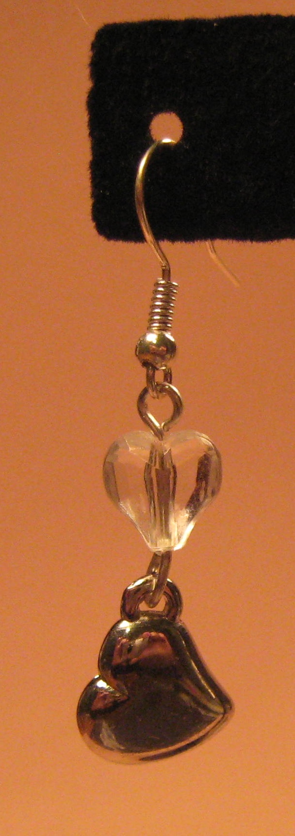 Lead free metal alloy heart drops hang below clear faceted acrylic hearts. Earrings have steel fishhook earwires.