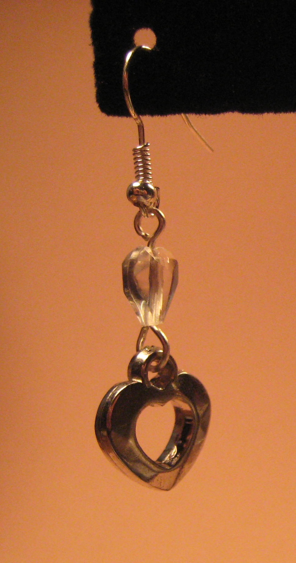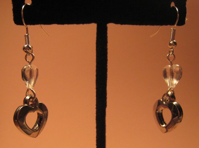 Lead free metal alloy heart drops hang below clear faceted acrylic hearts. Earrings have steel fishhook earwires.