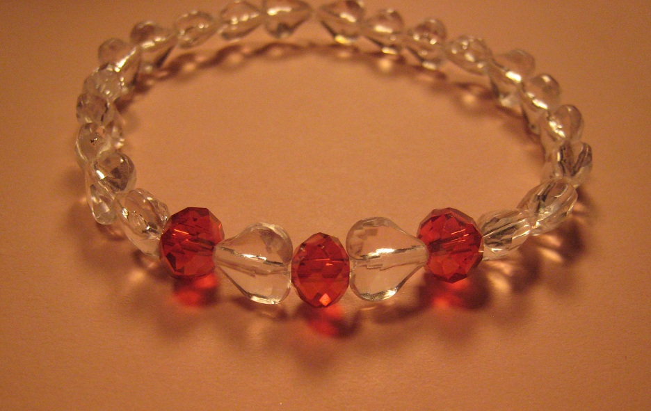 Beautiful crystal stretch bracelet made out of light Siam Swarovski crystals, and clear acrylic faceted heart beads.