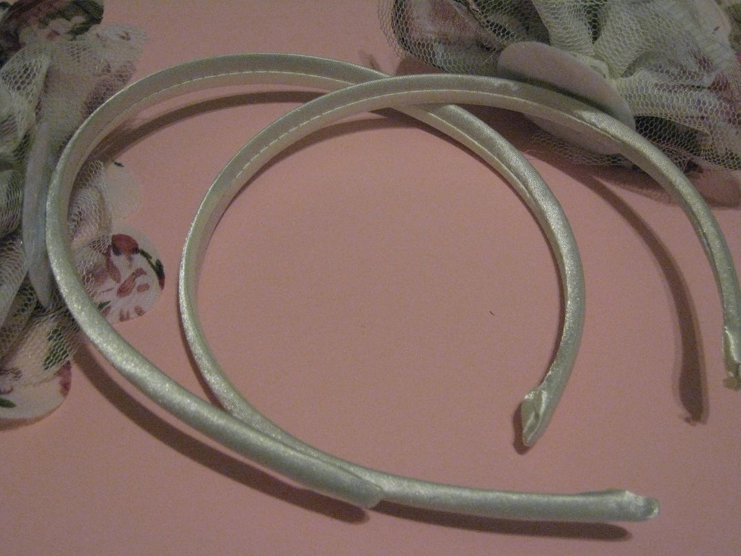 Satin fabric around an adult sized headband with a organza and fabric flower.