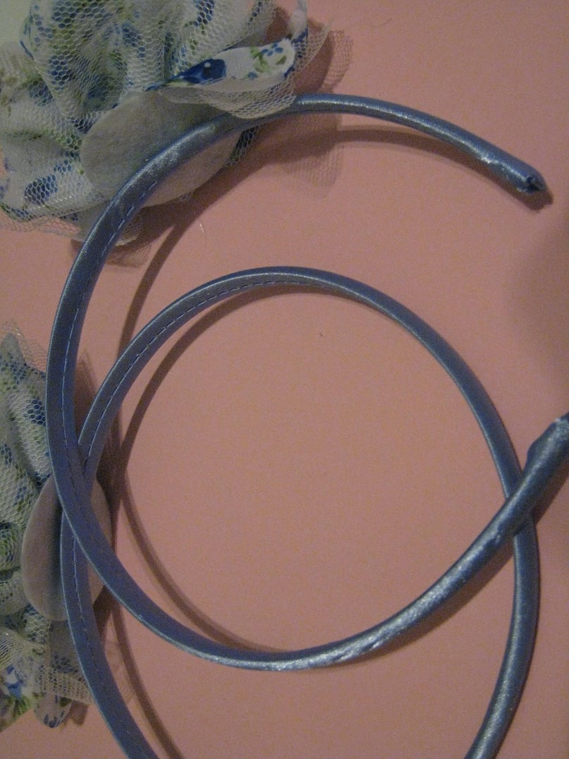 Satin fabric around an adult sized headband with a organza and fabric flower.