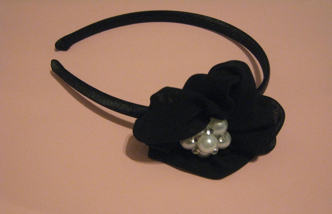 Satin wrapped plastic adult sized headband with satin like fabric flowers, artificial pearls and rhinestones.