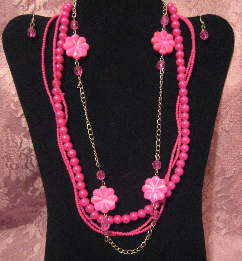 Adorable multi-layered necklace featuring acrylic crystals and pearls, glass seed beads, and plastic flowers on a chain.