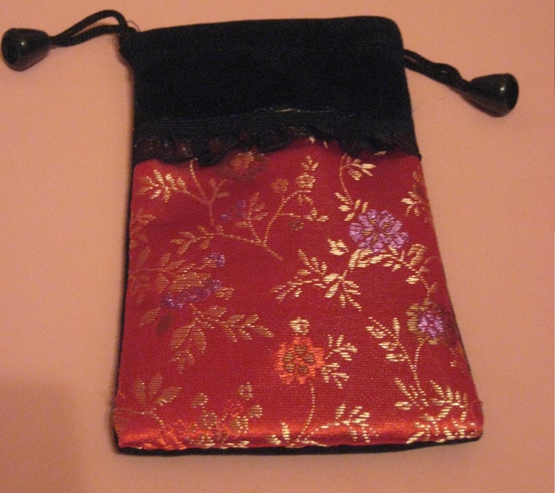 This pretty cinch pouch cell phone purse is handmade out of satin cloth with some lace detailing. The pouch opens up to hold items 5x3". The cinch closure helps protect items from falling out. Comes with a 36" carrying cord to wear over shoulder or crossbody.