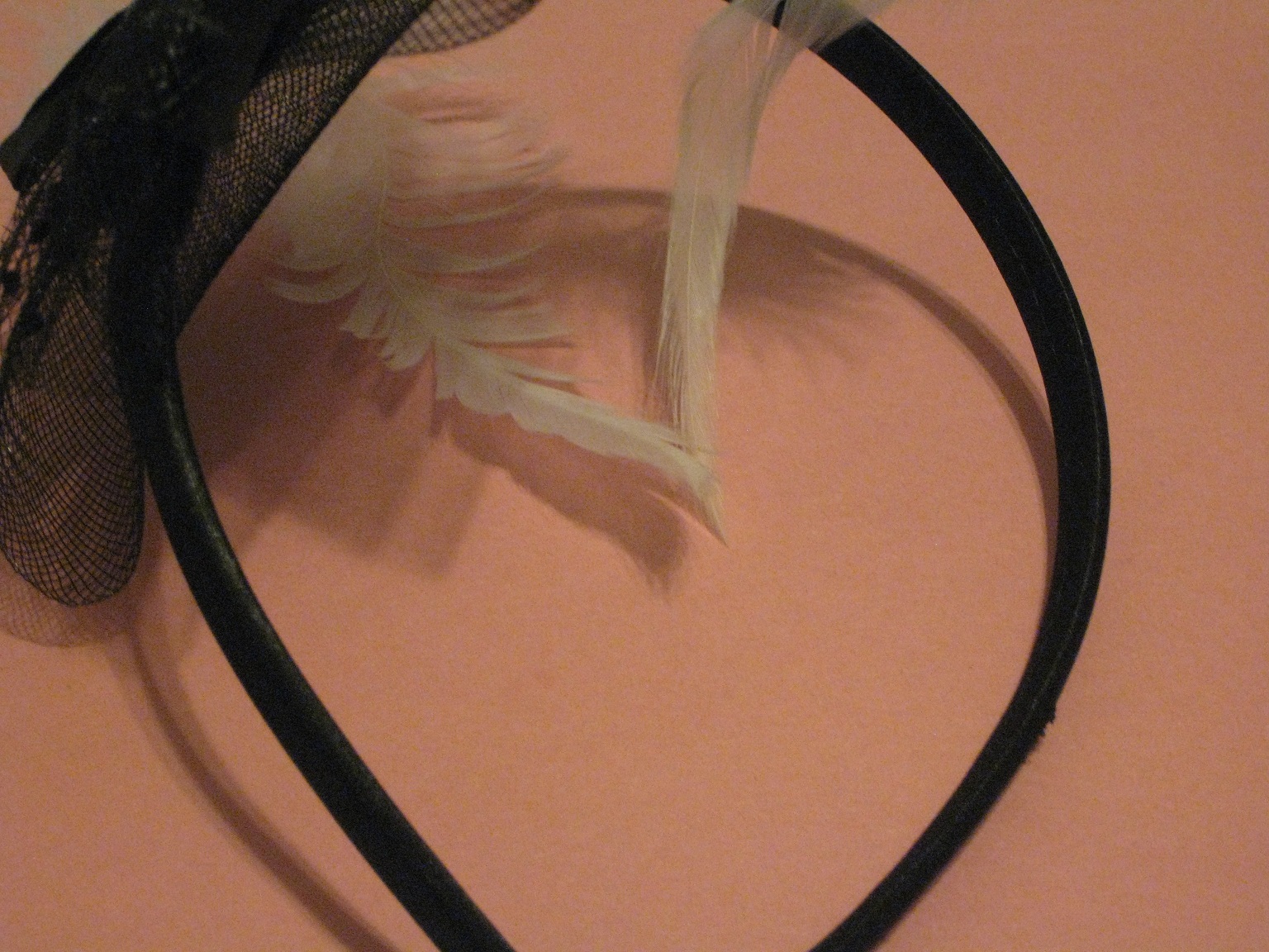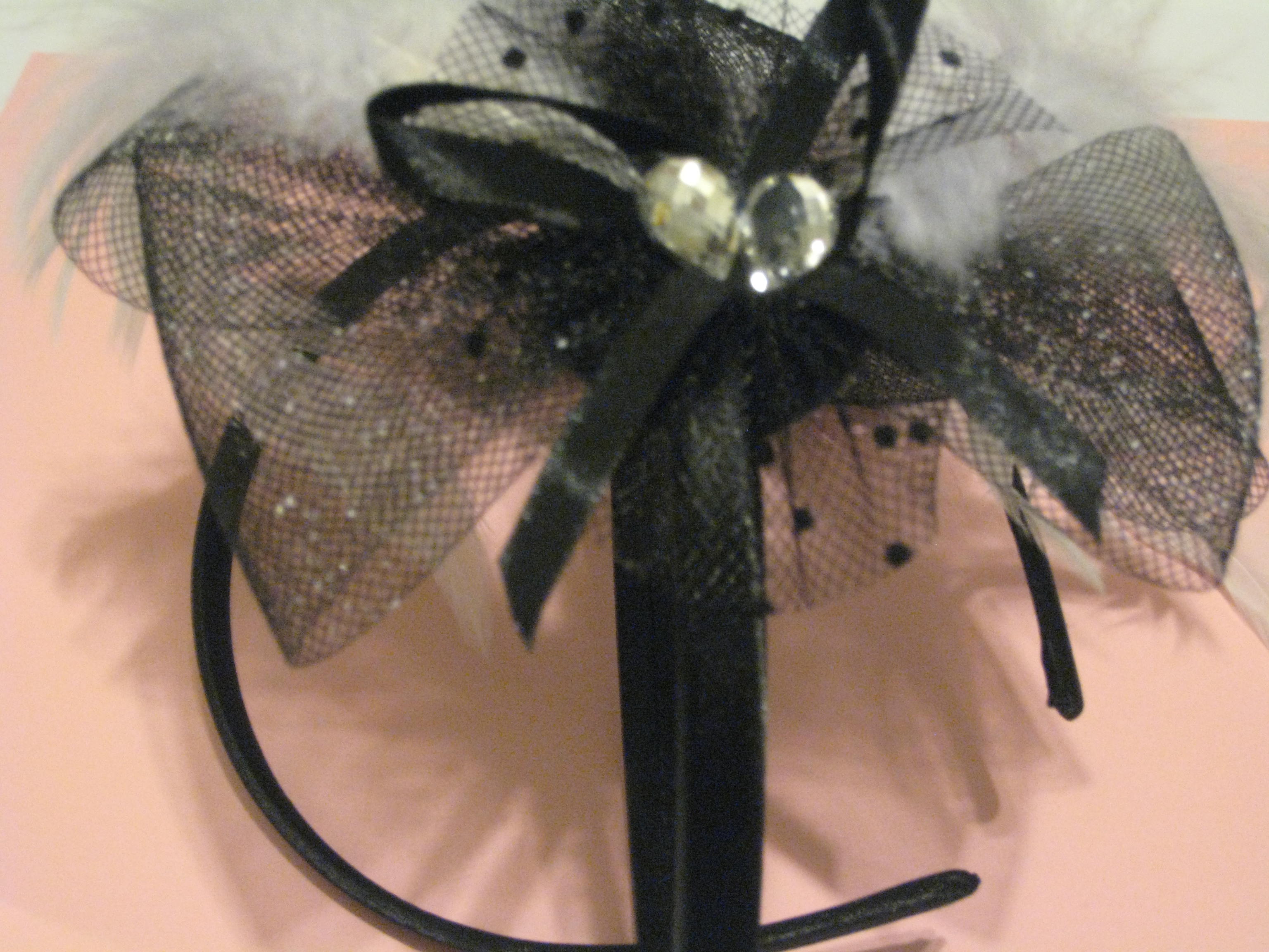Mesh organza with bows and feather accents with rhinestone centers on an adult sized headband. Feathers and organza measure 2 1/2" across and are secured to the headband with hot glue and felt backing.