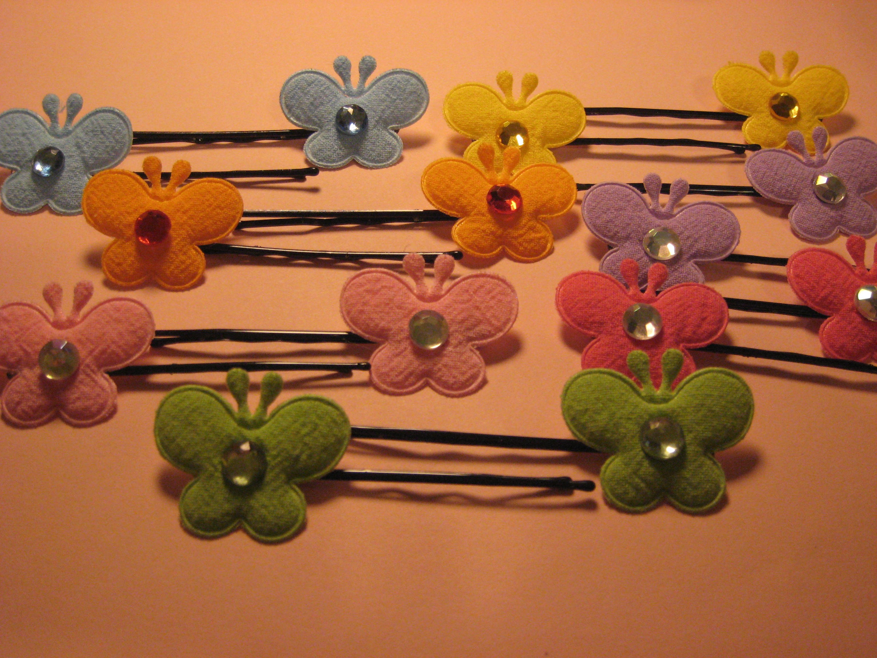 Cute tiny butterflies with a rhinestone center hot glued on to a bobby pin.