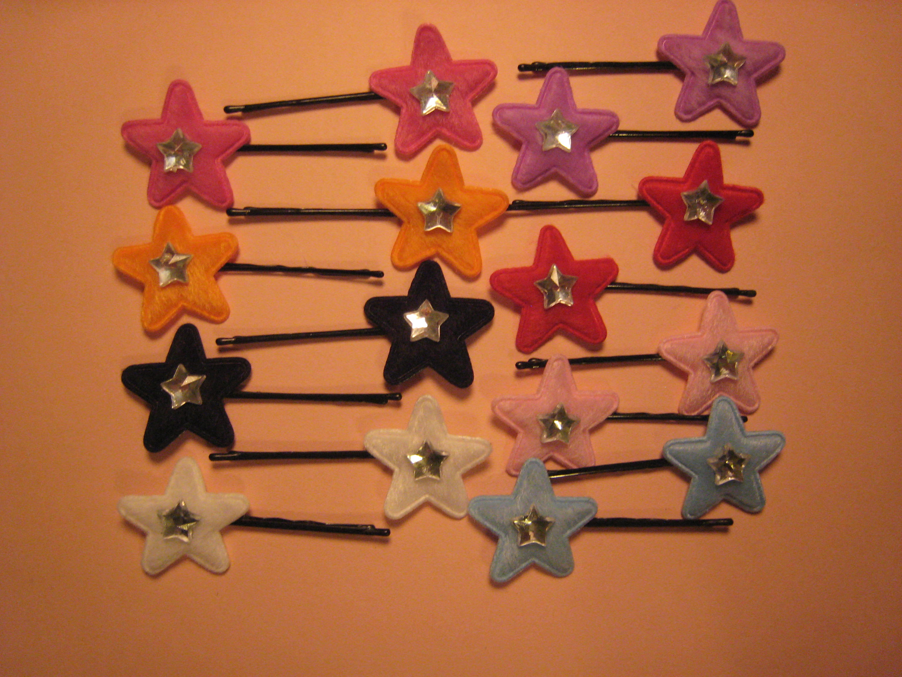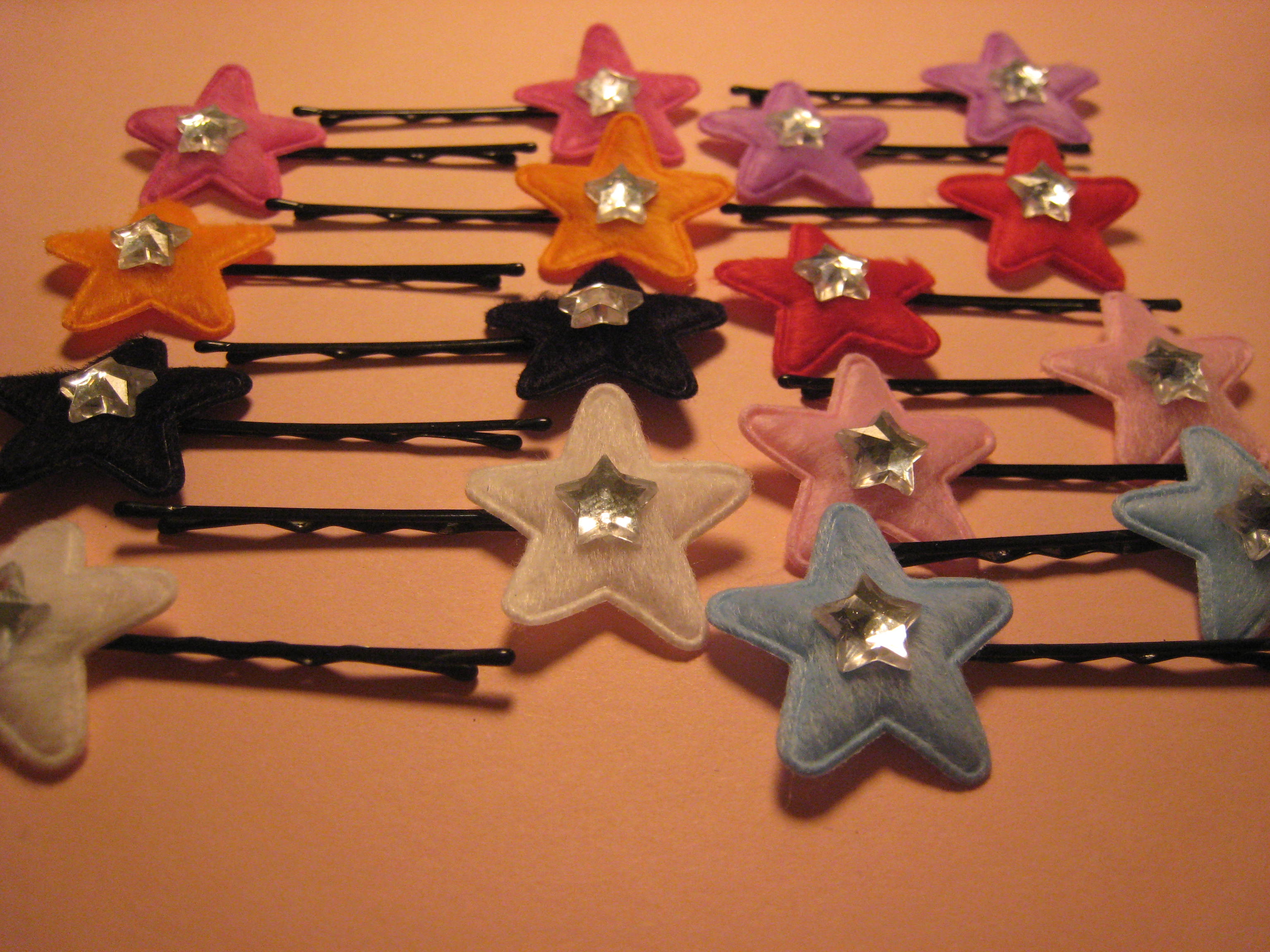Cute tiny felt padded stars with rhinestone centers hot glued on to a bobby pin.