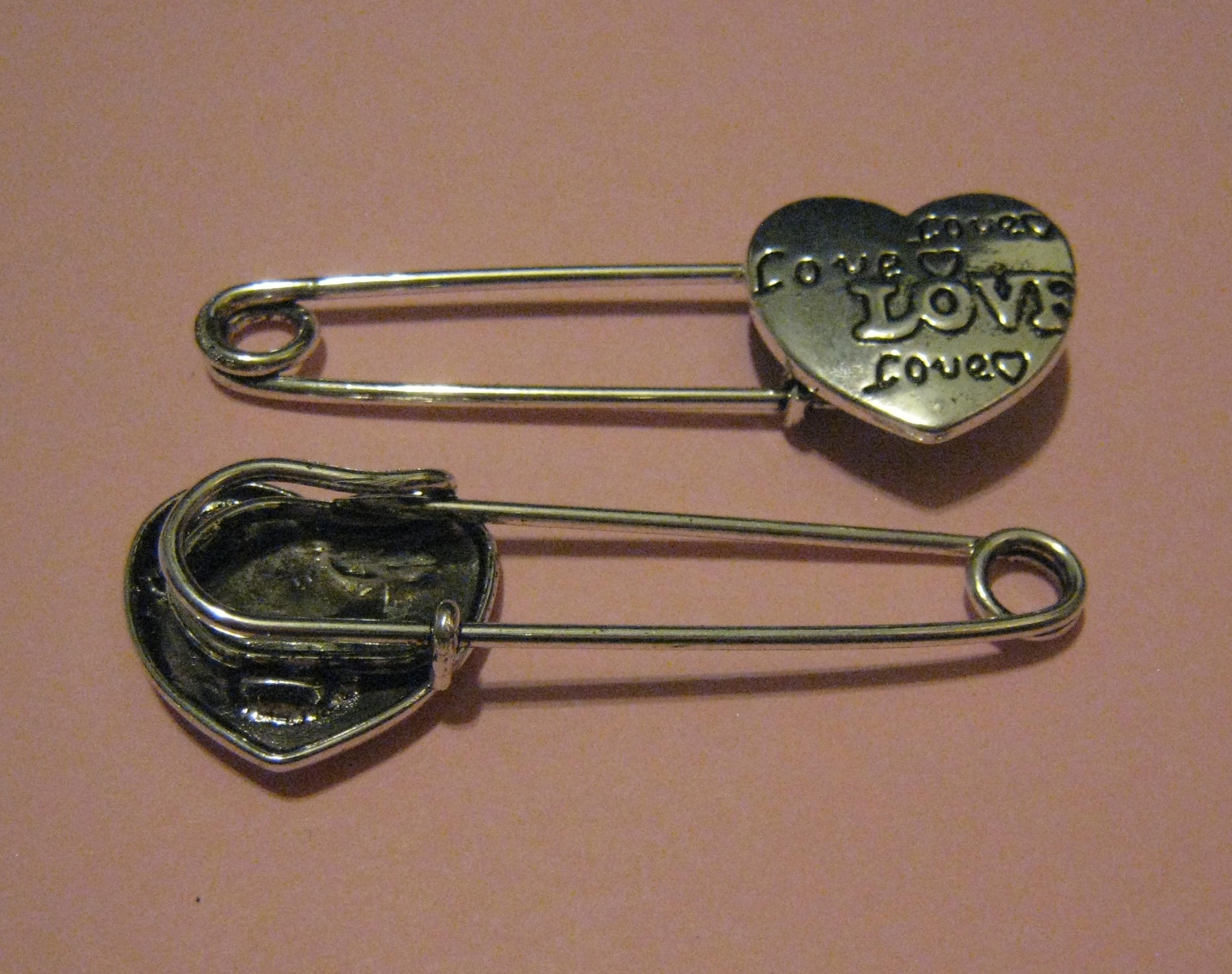 Antique Silver toned safety pin heart brooches add a little something extra to any outfit. Made out of alloy(Lead and nickel safe) these pins are lightweight and stylish. Measures approx. 2 3/8" Long.