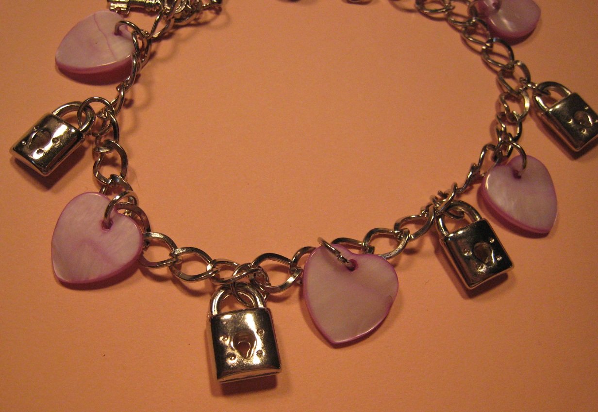 Purple shell hearts with key and locks shaped charms make up this beautiful adjustable 9 1/2 Inch bracelet.