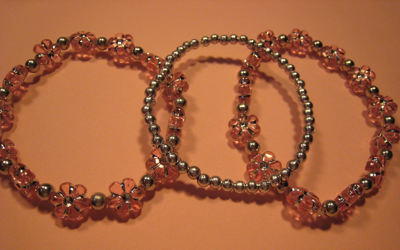 Lightweight and durable stretch bracelets with silver beads and highlighted with stylish flower shaped beads in a beautiful shade of pink. Includes the 3 bracelets shown.