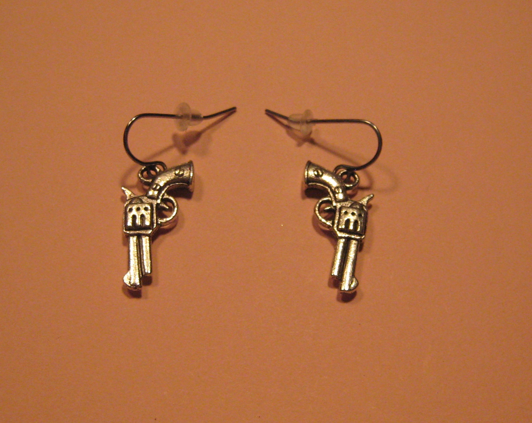 1 1/4" antiqued pewter (lead & nickel free) gun charms on steel fishhook earwires.