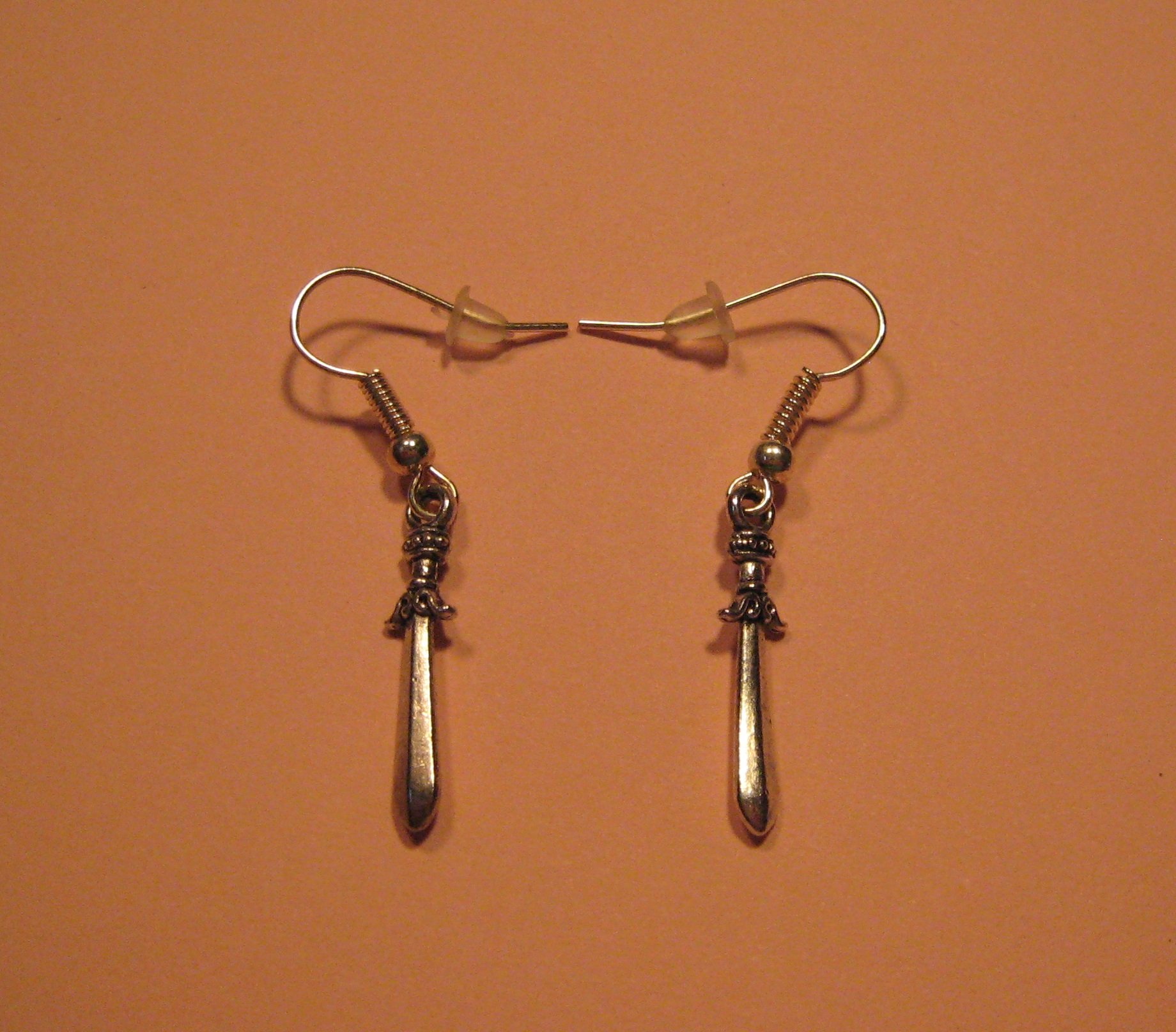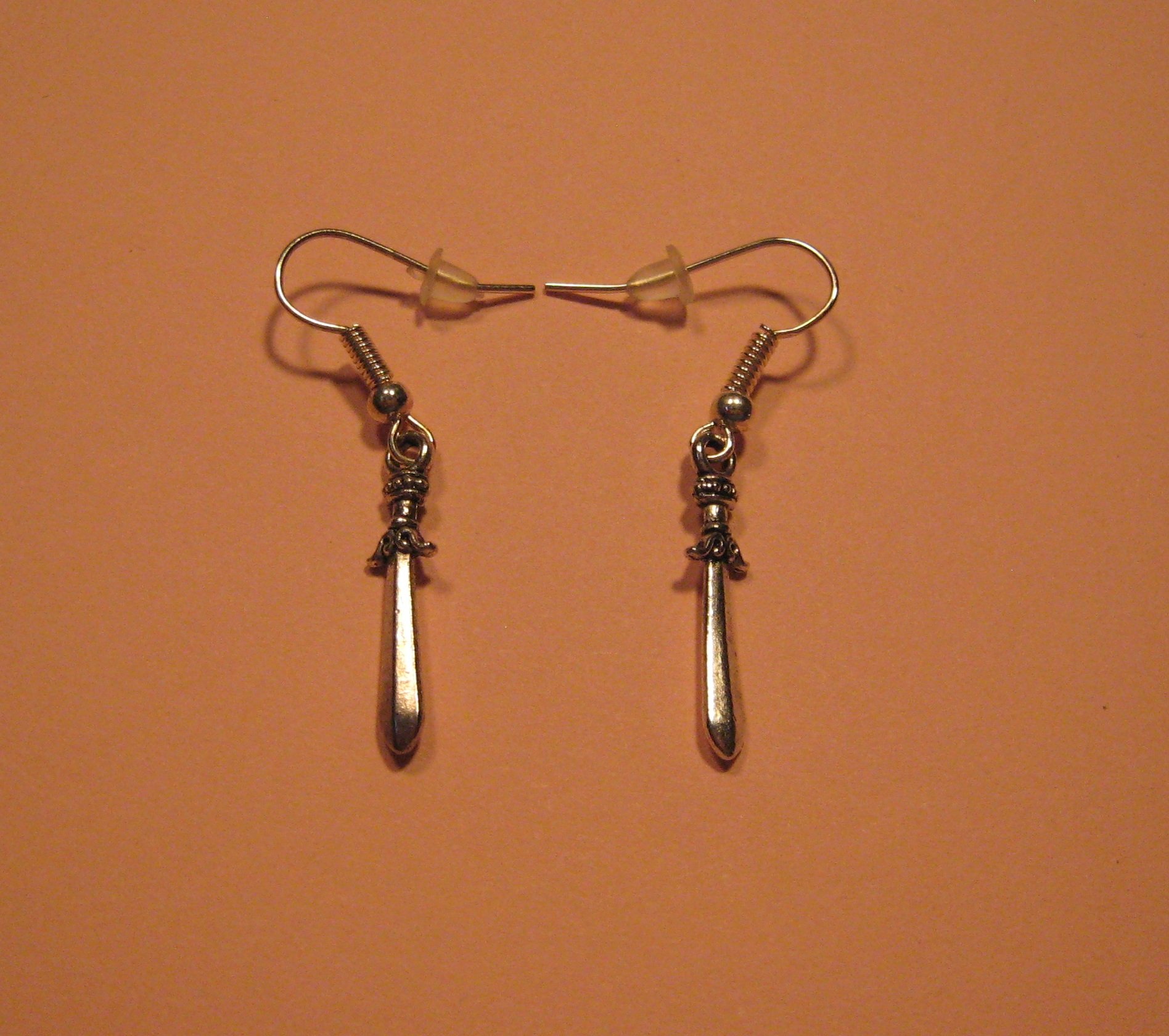 1 1/4" antiqued pewter (lead & nickel free) sword charms on steel fishhook earwires.