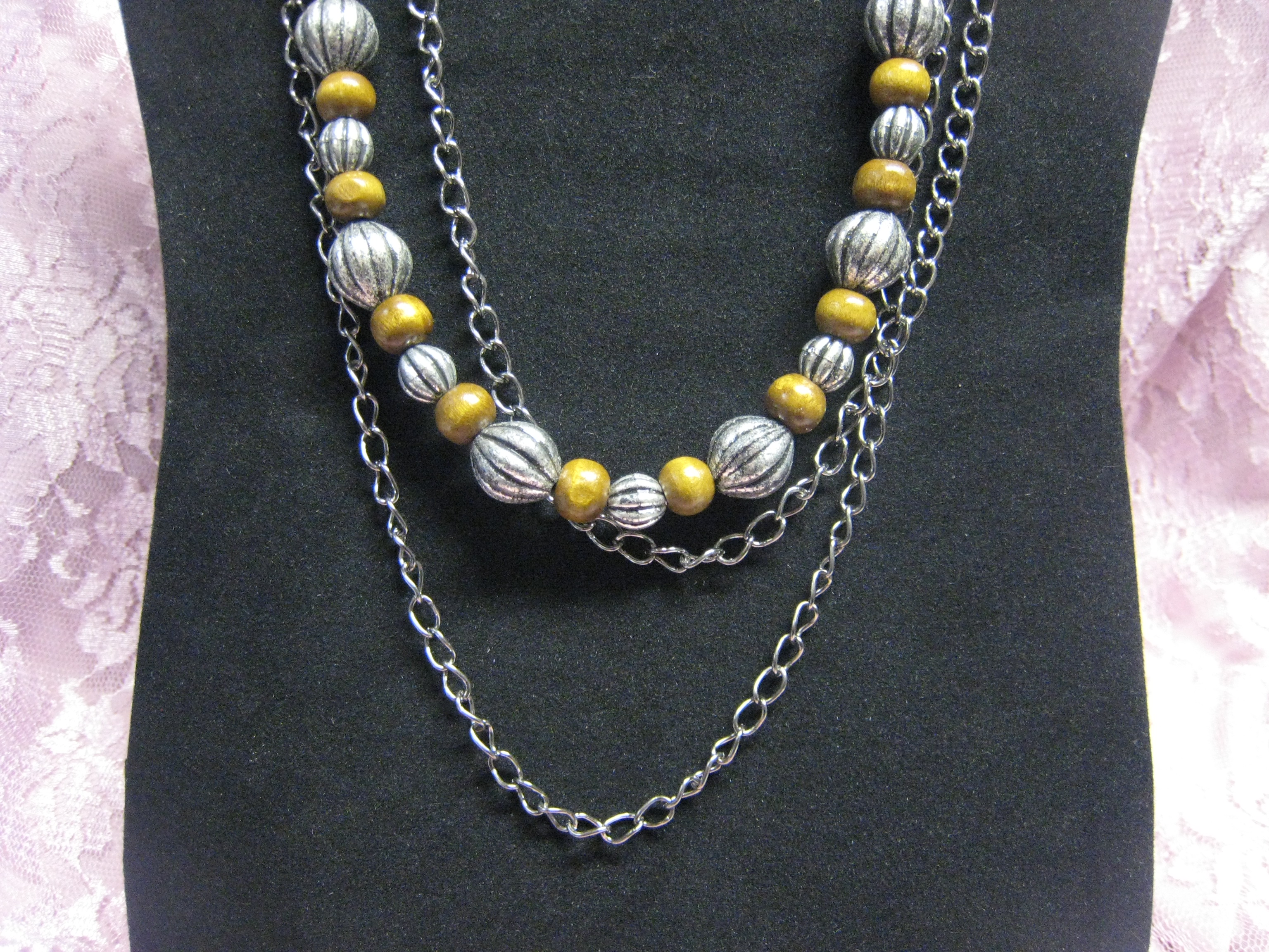 Tan wood beads, silver highlight beads and chain make up this necklace ensemble.